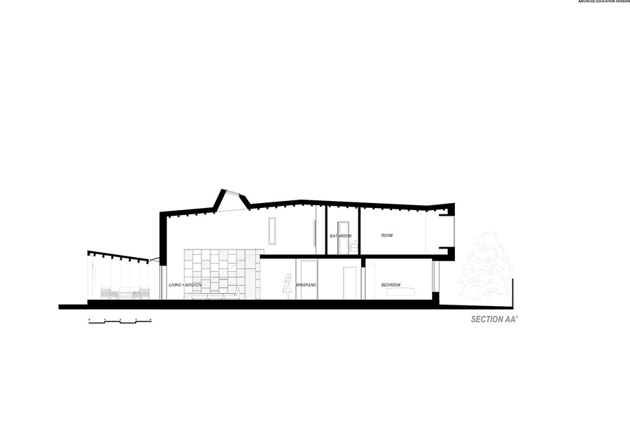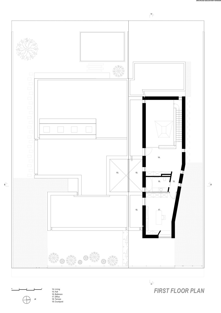 The small residential ensemble consists of two apartments paired on one side, located in southern Timișoara. Situated in a predominantly ground floor and one upper floor houses area, an asymmetric approach was chosen. One apartment occupies the ground floor, while the other is more compact, spanning both ground and partial upper floors. Together, they create a dynamic yet harmonious pattern facing Oedip street on the east side and a more diverse layout towards the rear courtyards on the west side. Both apartments converge towards the inner squared atrium, providing natural light, ventilation, diverse interior views, and a glimpse of sky at a 3 meter high cornice. The bamboo plantation enlivens this hidden core.