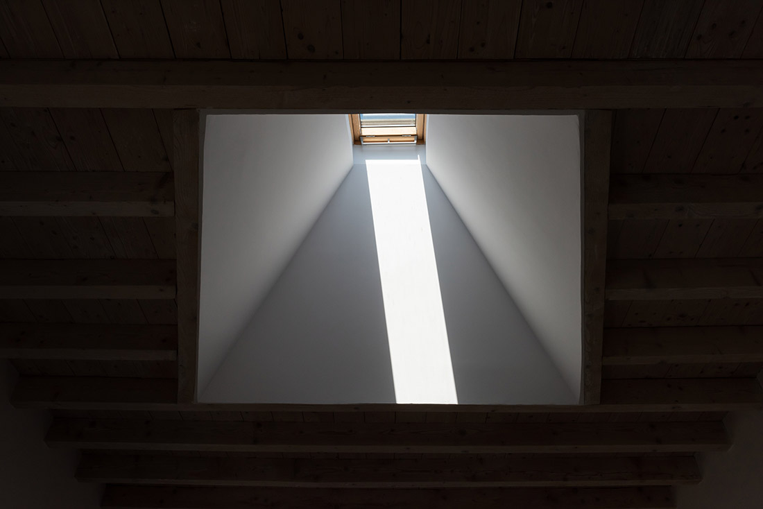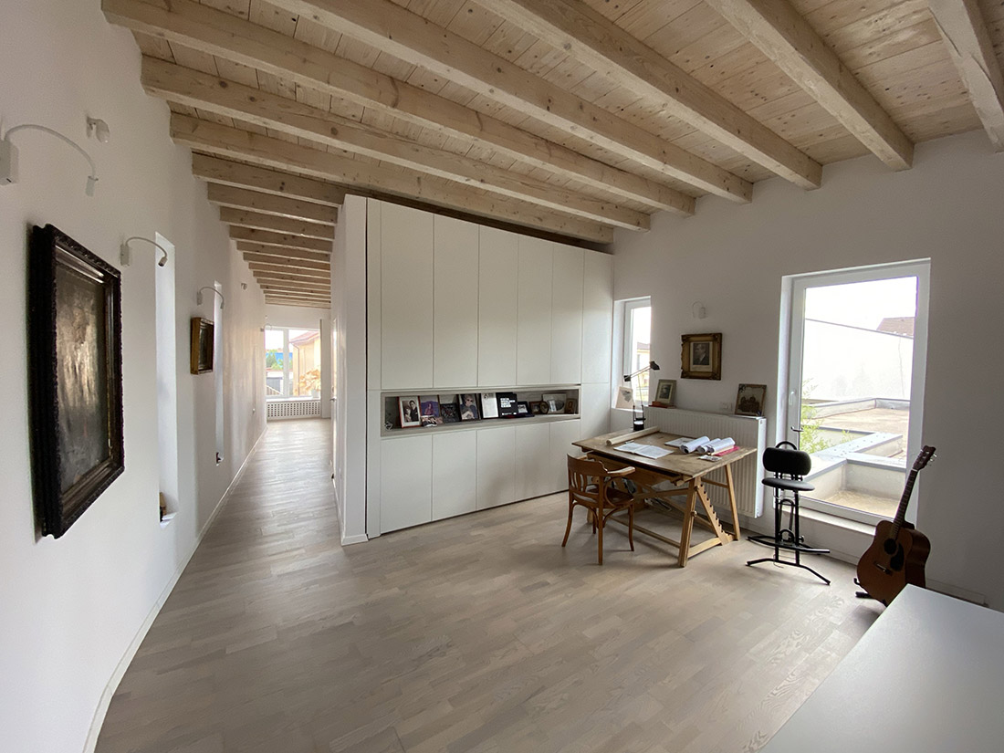 In both apartments, natural light fills the interior spaces through dynamic rays from the atrium, narrow windows, and skylights. Generous intermediary spaces accompany each “open air room,” while wooden structural elements and 44 cm brick exterior walls offer summer coolness, winter thermal protection, and a specific render finish. Skylights double as natural ventilation chimneys, particularly in the two-floors apartment. The height regime and space pattern, as well as the landscaped lawn versus wild garden, distinguish between the apartments.