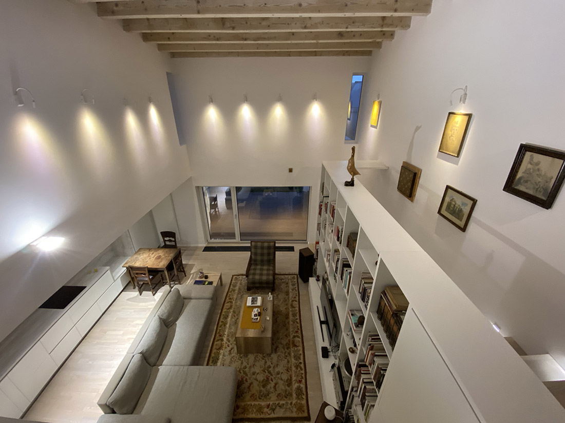 The ground and one-floor apartment accentuates the east-west axis, enhancing interior spaces with expansive views and emphasizing their oblique-ascensional character. External curtains surrounding the covered inside/outside space amplify wind effects and magical light reflections, especially at sunset. The living room boasts acoustic qualities, with a double-height dominated by the L-shaped library bookcase. Integrated furniture design characterizes all spaces, reflecting the collaborative investment of the architect and contractor, now occupied by both architects and final end-users, fostering a dialogue-rich environment.