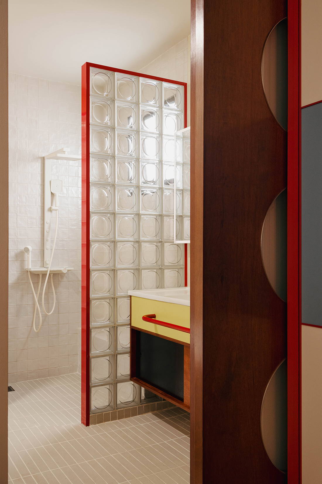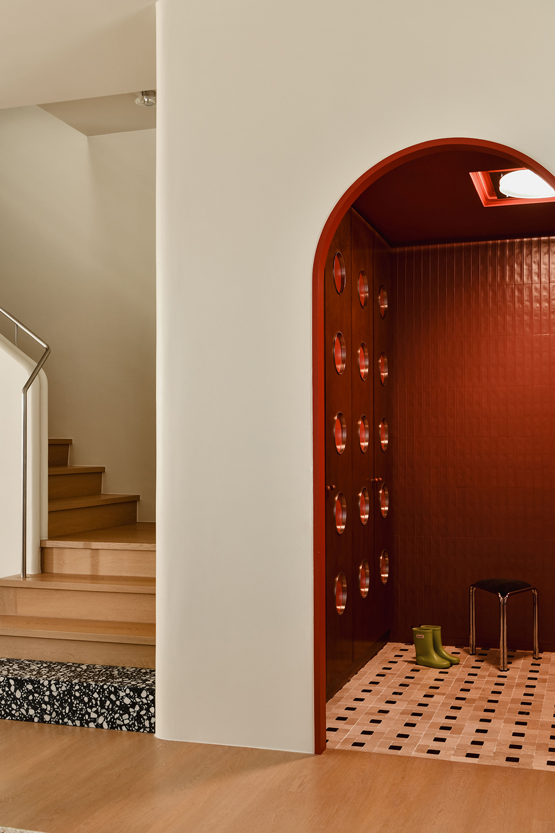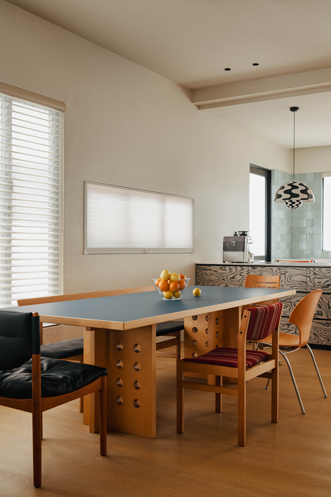 The priority challenge is to expand the volume of space; we open up the walls in first floor bedroom and ground floor to bridge the volume, even indirectly draw patio at the back as part of visible interior volume by shade covering. By employing the late architect Frank Lloyd Wright’s technique of compression and expansion, we capsule unfolds into an open, flowing space, one of the period’s hallmarks. In ground floor, the arresting foyer is wrapped in handmade scarlet tiles, cherry-hued cabinets with ruddy discs, and a marble floor with perforated line patterns. It’s a combination that has a way of pulling you in and suspending reality. Upon transitioning bigger volume living and dining space, a noticeable play of red, blue, and yellow started to drive while complimenting with iconic pieces of furniture.