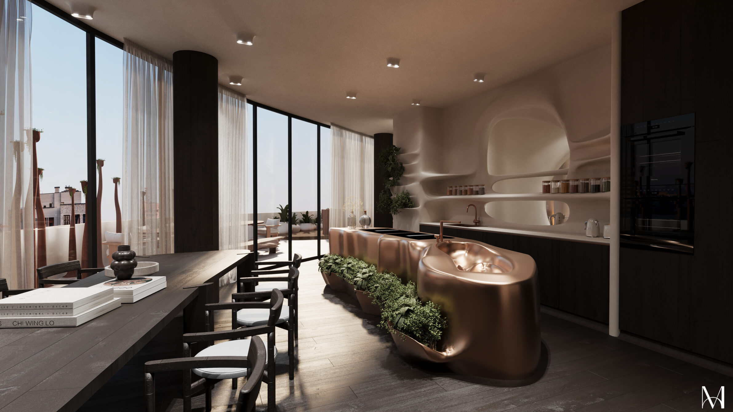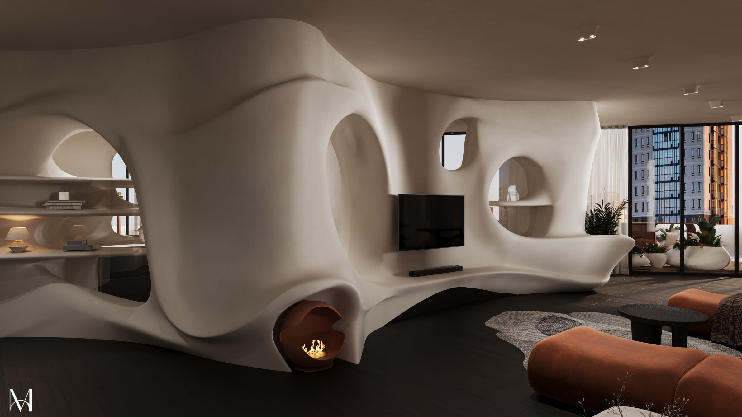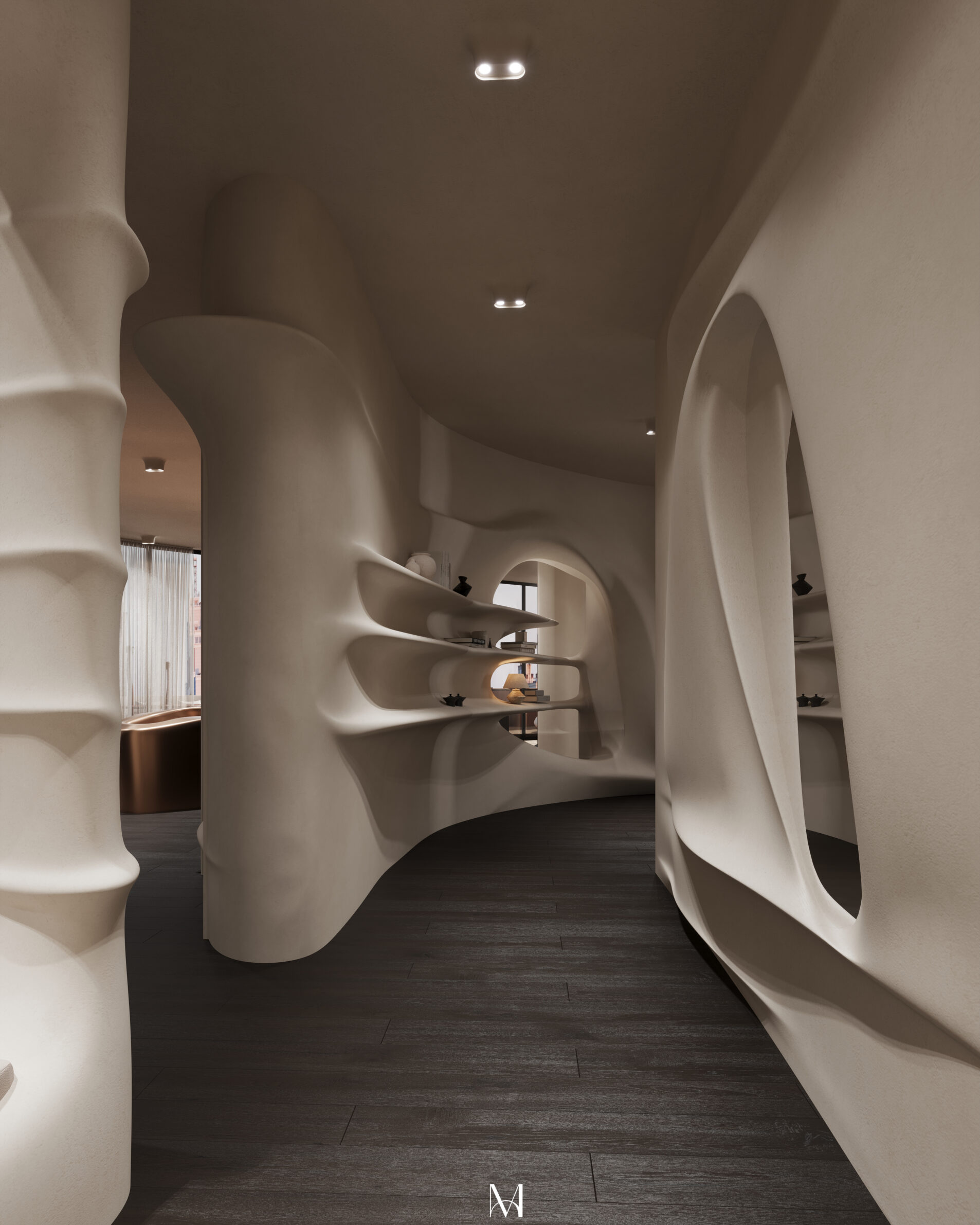 The interior unfolds as a continuous spatial landscape rather than a sequence of rooms. Inspired by the quiet intelligence of natural forms, the apartment is shaped through fluid surfaces and soft transitions that guide movement gently through the space.