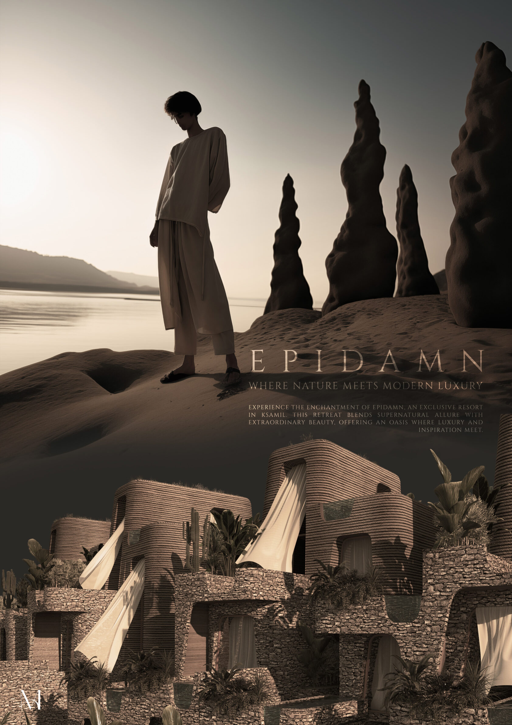 The architectural language of Epidamn is inspired by organic forms and natural materials. Stone, clay, and wood form the core of the material palette, allowing the architecture to emerge as a natural extension of the landscape rather than an imposition upon it. Soft, fluid geometries and textured surfaces echo the rhythms of the surrounding terrain, establishing a dialogue between architecture, land, and sea.