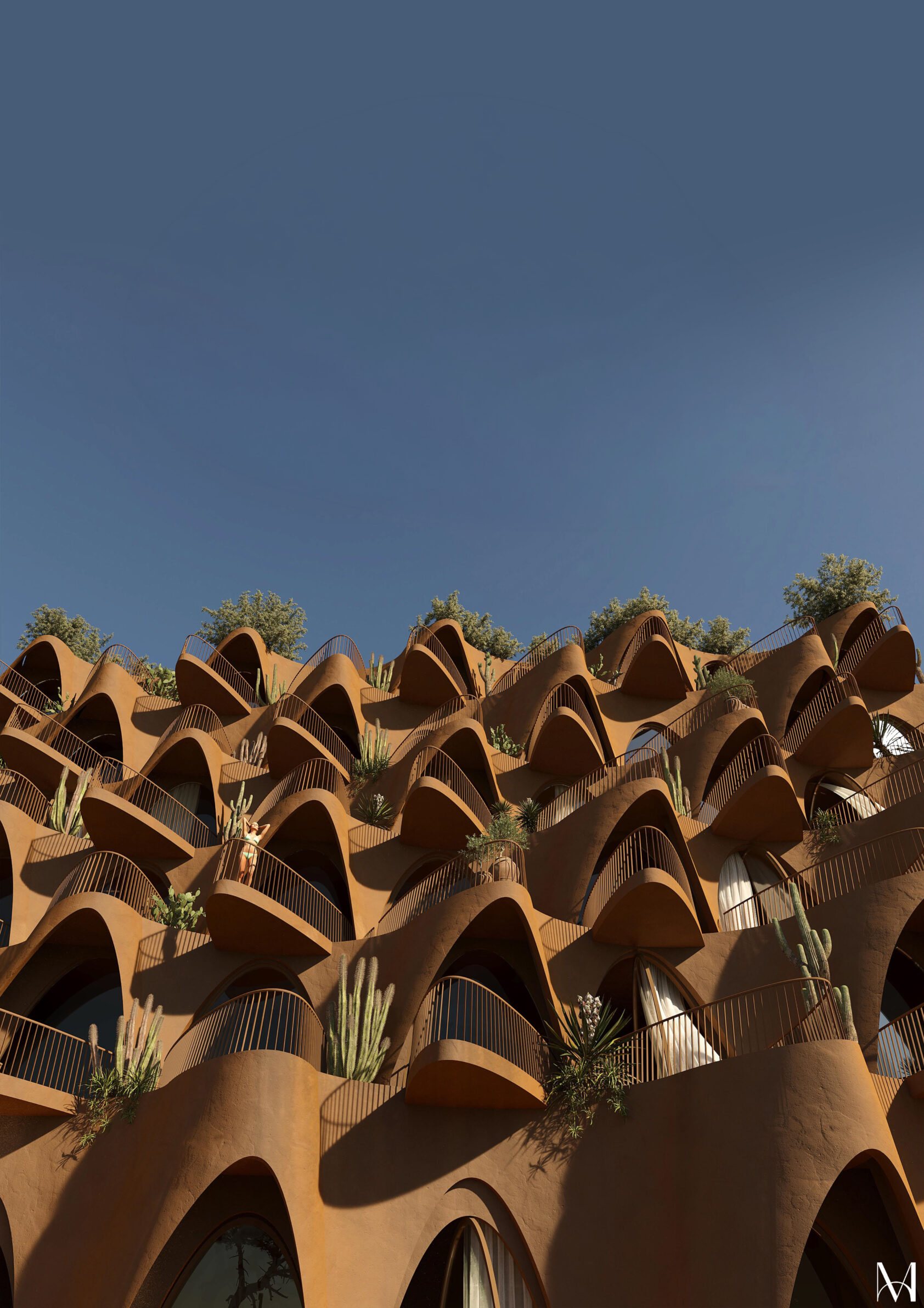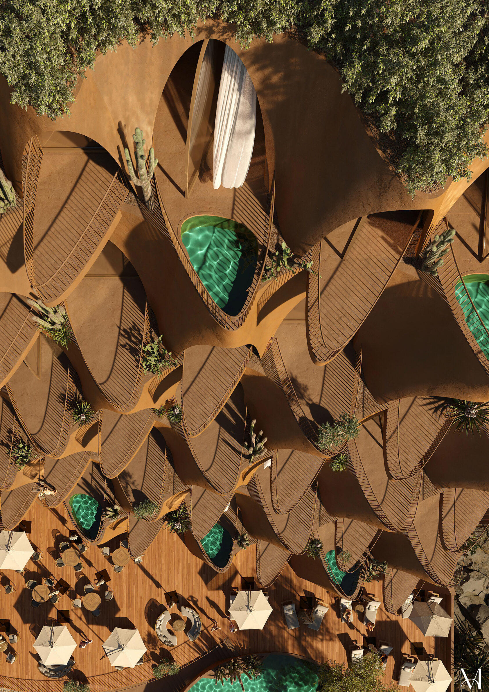 Located on the natural slopes of Dhërmi, the 43-room retreat is conceived as an organic continuation of the terrain rather than an intervention that dominates it. Curved terracotta volumes emerge from the hillside, creating an architectural language that balances brutal elegance with biomorphic softness.