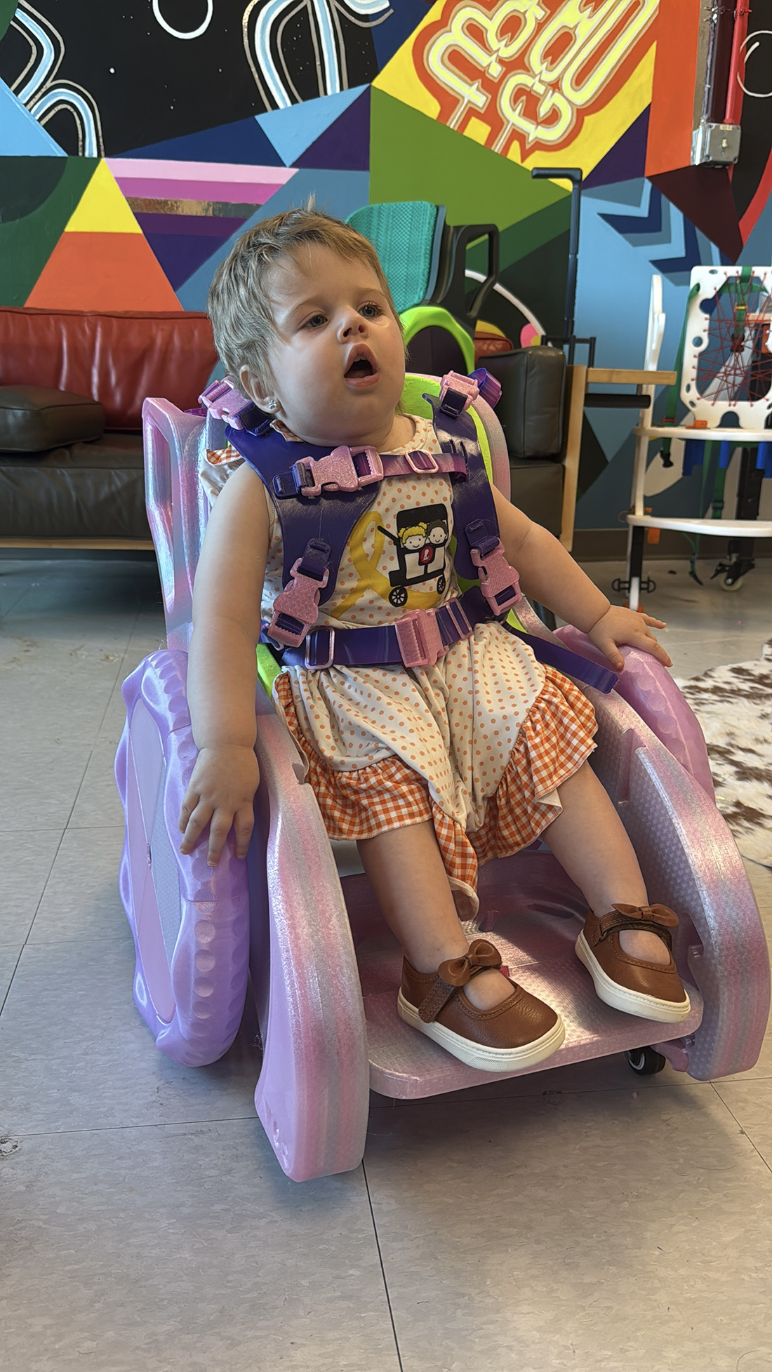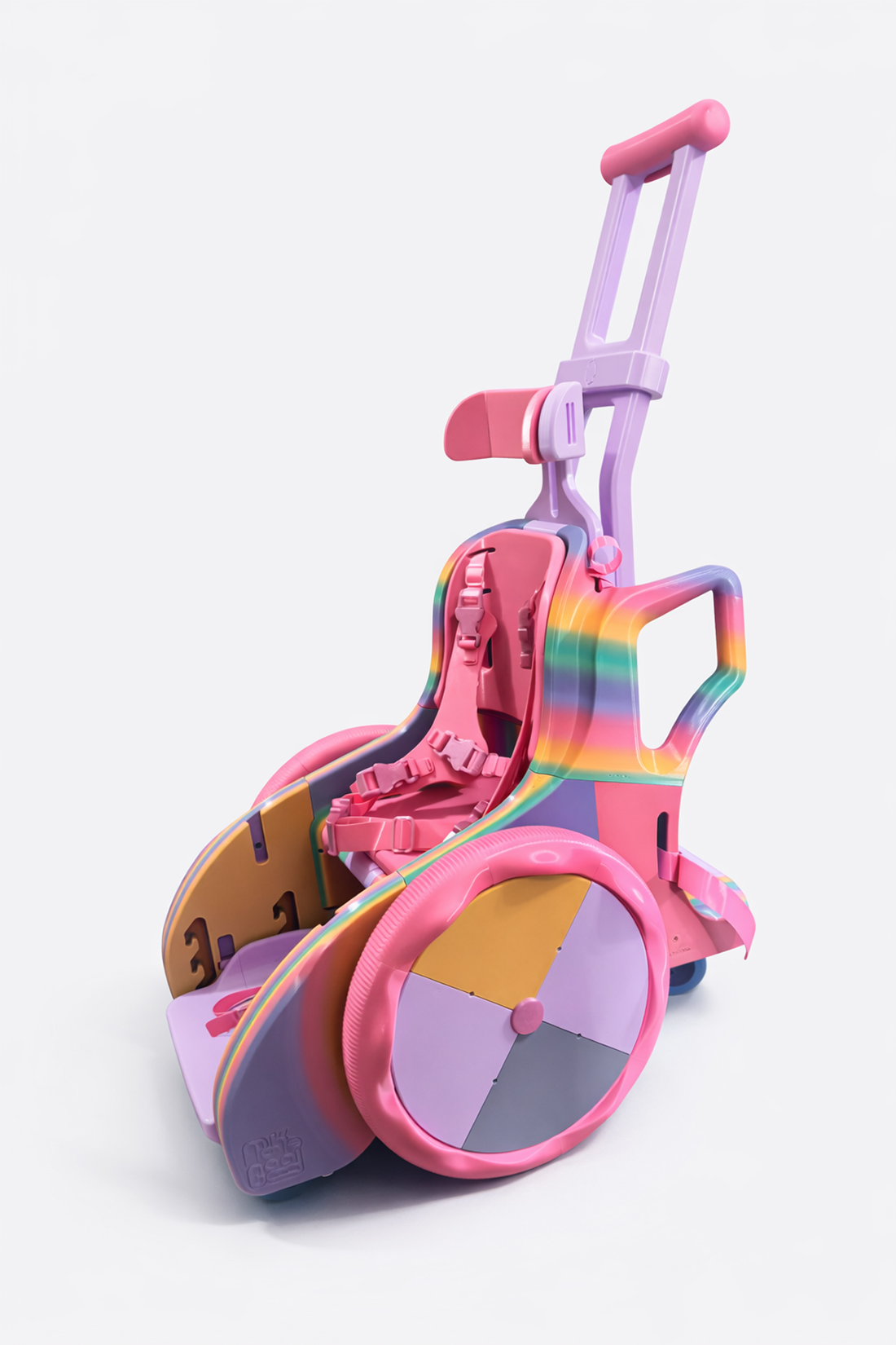 Intentionally designed to be child-friendly, this mobility device is welcoming, fun, and fits in at home or school. It is easy to fabricate and assemble, only requiring a standard, consumer grade 3D printer to make the chair body, straps, and cushions. A small amount of hardware is required to finish the build. This 3D printed device is available for free under a public domain open source license to enable distributed manufacturing using 3D printing worldwide.
