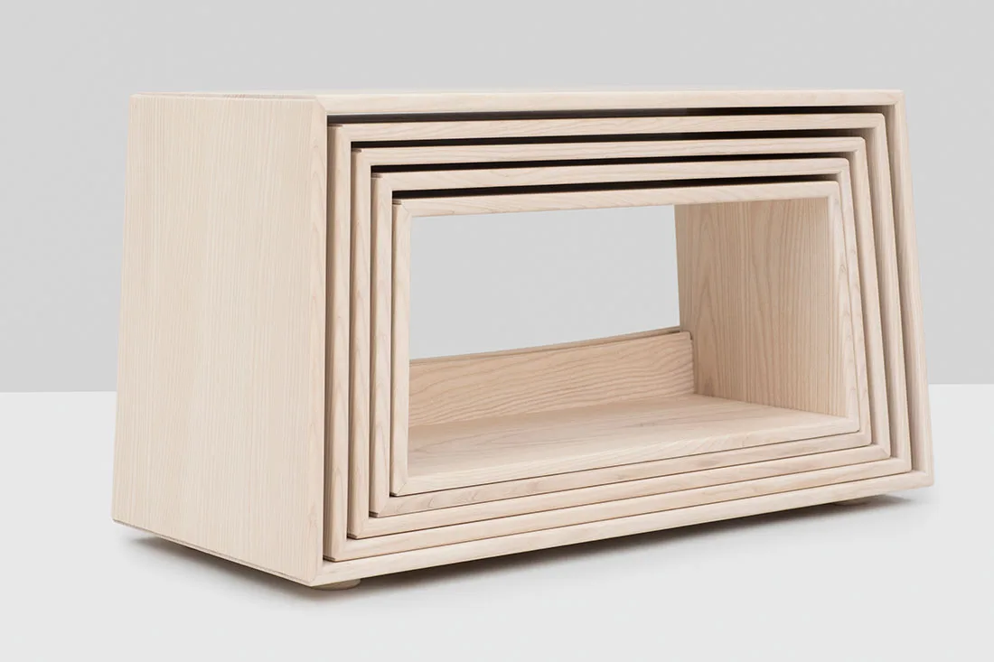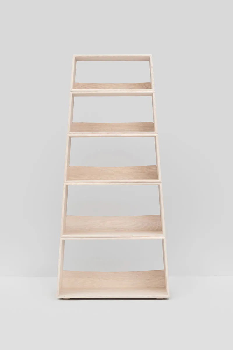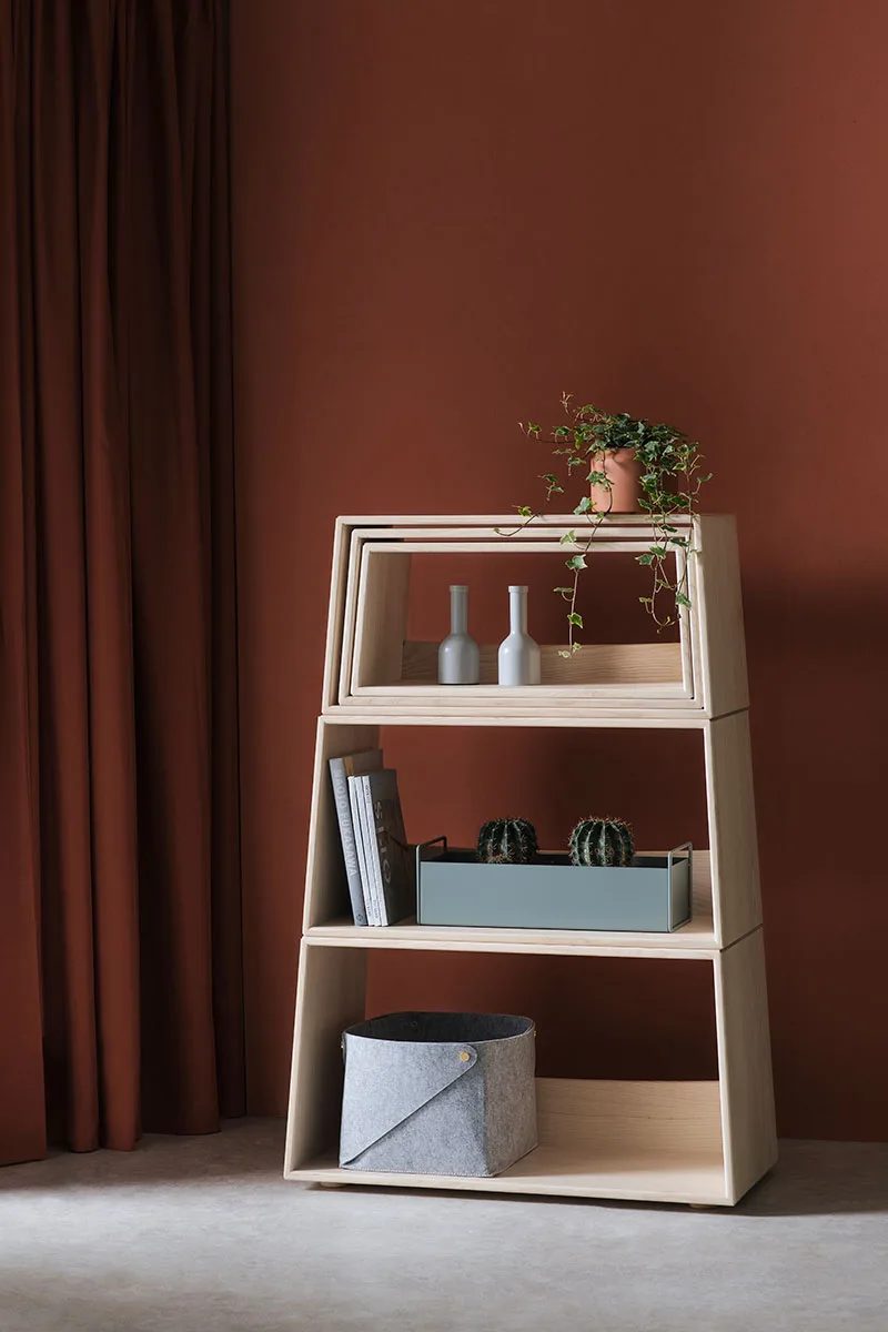 Design of the shelf originates from the logic of packing construction elements by the smaller-into-bigger principle. This approach results in tilting the lateral sides and gradual shortening of the storage space. Assembling the shelf module upwards creates a harmonious stepped structure which has a suitable shape to be positioned by the wall or freely in space.