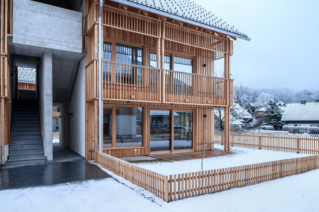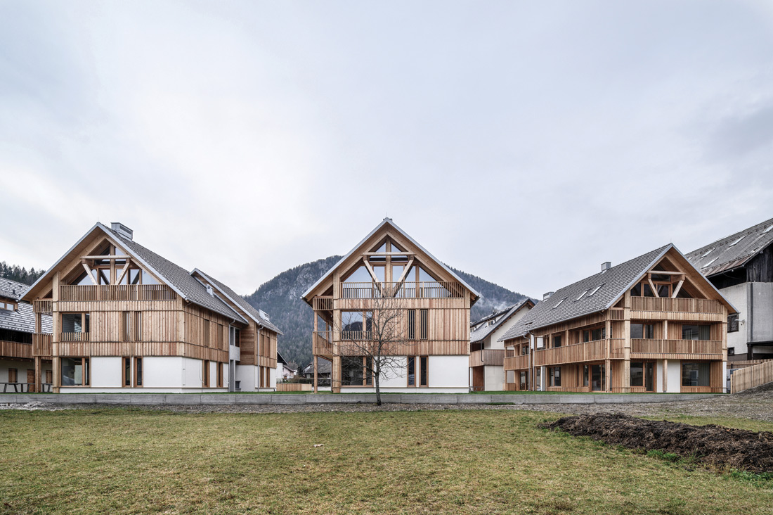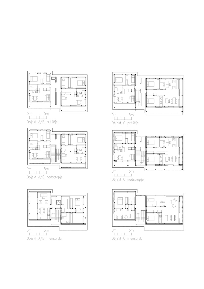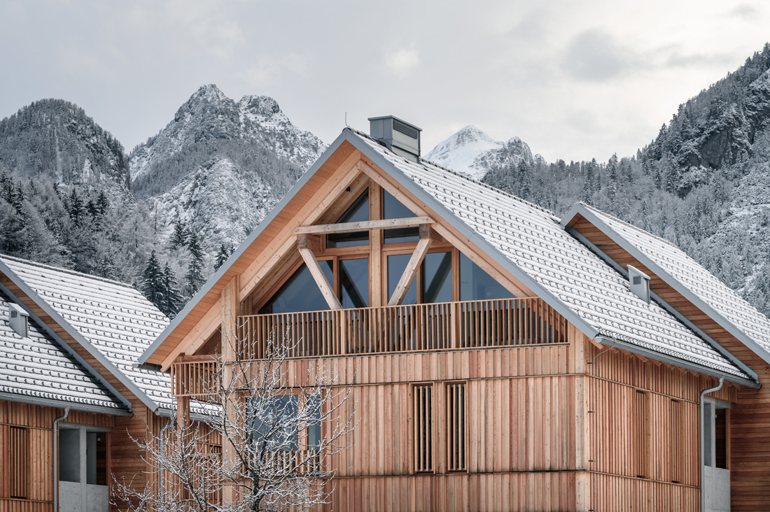 The three apartment facilities are located in the district of the Pišnica river, in the heart of Kranjska Gora. In each of the buildings there are 5 to 6 apartments located. A very simple apartment type was selected, with an entrance from the center of the layout, which requires central access from the center axis of the layout. As a result, the entire building body is broken down by a central staircase. The layout is highlighted by a floor shift that reduces the sense of magnitude and the total length of the building.