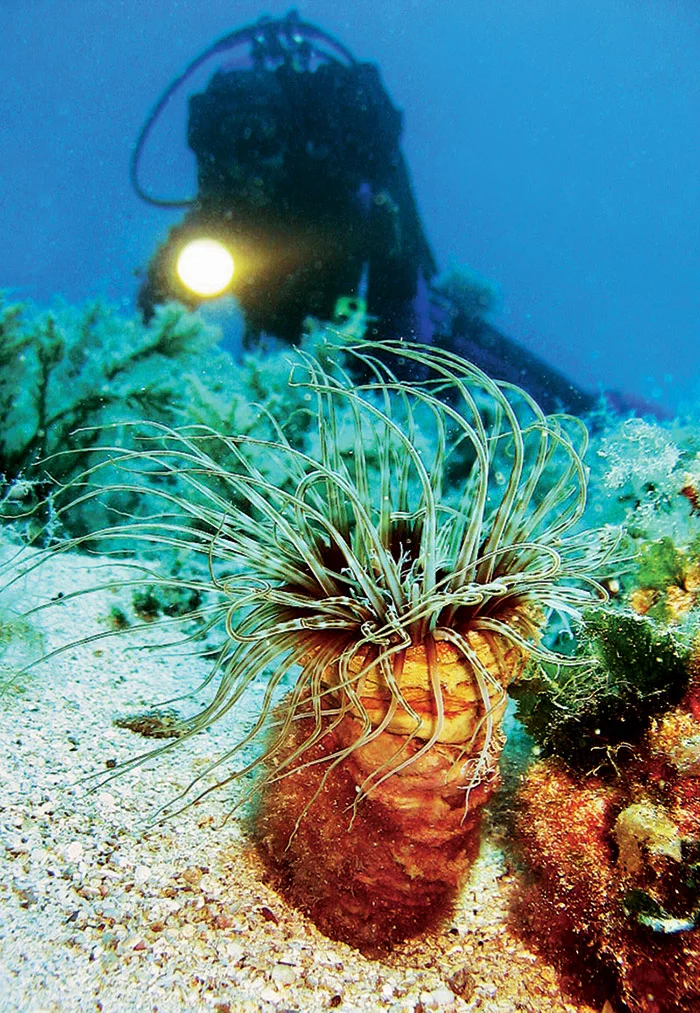 We go on. On the top of the plateau we observe black-and-white dotted sea slugs (peltodoris atromaculata) and purple sea slugs (flabellina affinis). Then we descend down the “stem”, to 42 metres from where we start our slow ascent, exploring a whole new world. Sea life along the cliff is captivating and extraordinarily vivid. Spiny lobsters (palinurus vulgaris) peer out of their holes. I’ve never seen so many lobsters in one place. There are plenty of rather intrepid fish swimming past us. Tubeworms (spirographis spallanzani and protula tubularia) close their “flowers” as soon as we approach them. Matej signals to come closer – he’s found something, a big fish hiding in a crevice, which looks like a shark. Back on the boat, the guys tell us it must have been a mother conger eel (onos mediterraneus). It floats motionless in its home and watches us while we watch it. But I’m not afraid, even if it is a shark – the view through the mask makes me feel as if I’m watching this undersea world on a TV screen.