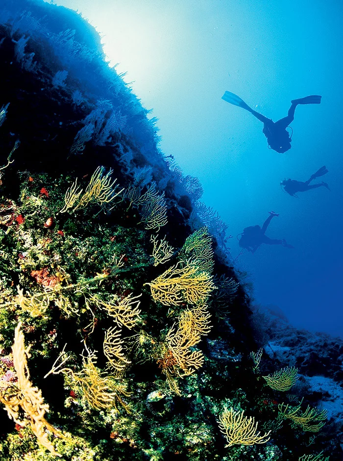 I check the pressure of the air on the manometer. There’s a little more than a quarter left. We’re back at the top of the plateau. There’s still 35 metres of sea above us. I shiver with cold. I can hardly squeeze the regulator with my teeth so that it doesn’t slip out of my mouth. In early May, at such a depth the water temperature is a mere 12 degrees. After 40 minutes I can no longer warm up, but the dive is coming to an end. During the ascent, I observe how the flora, fauna and the colour of the light change with the depth.