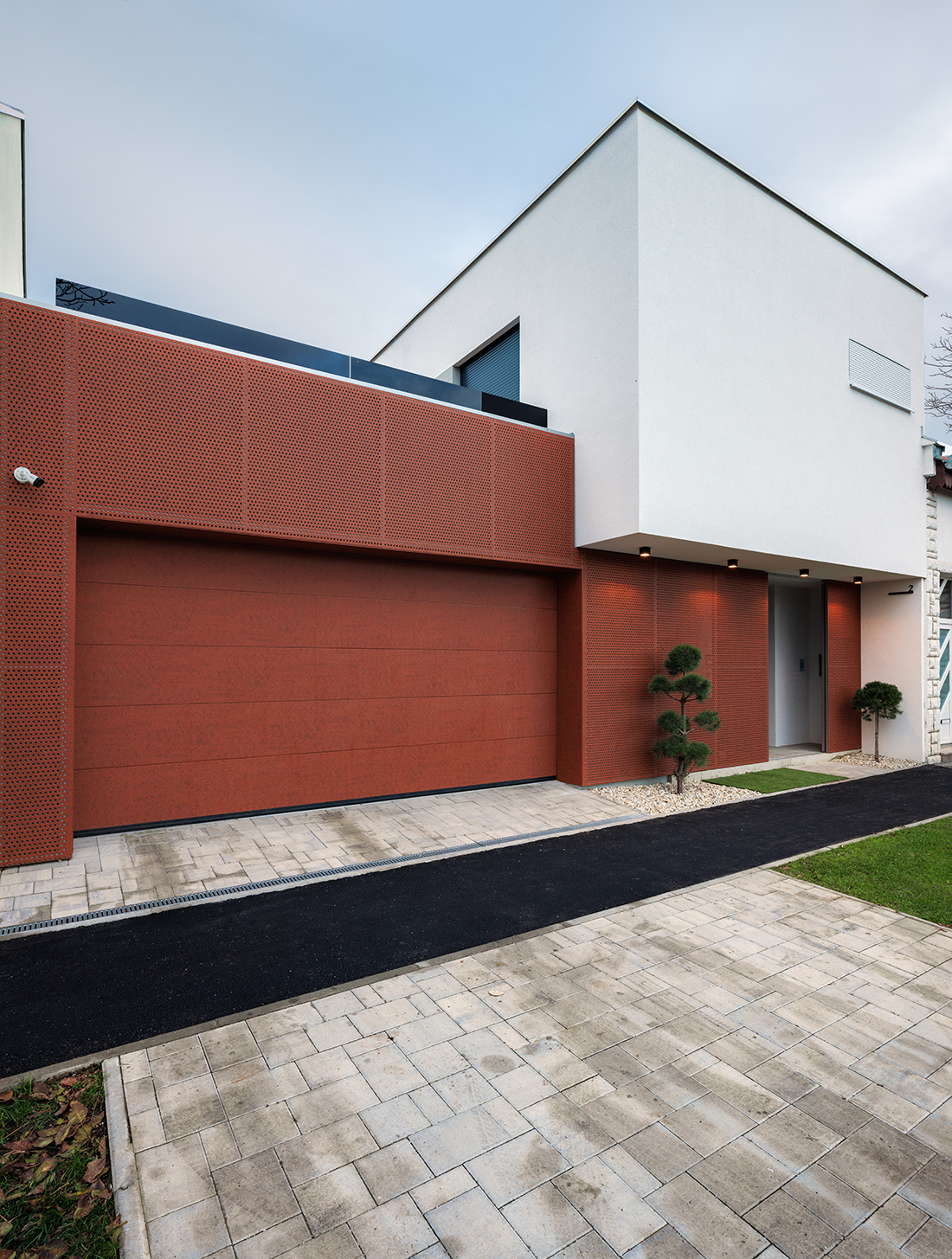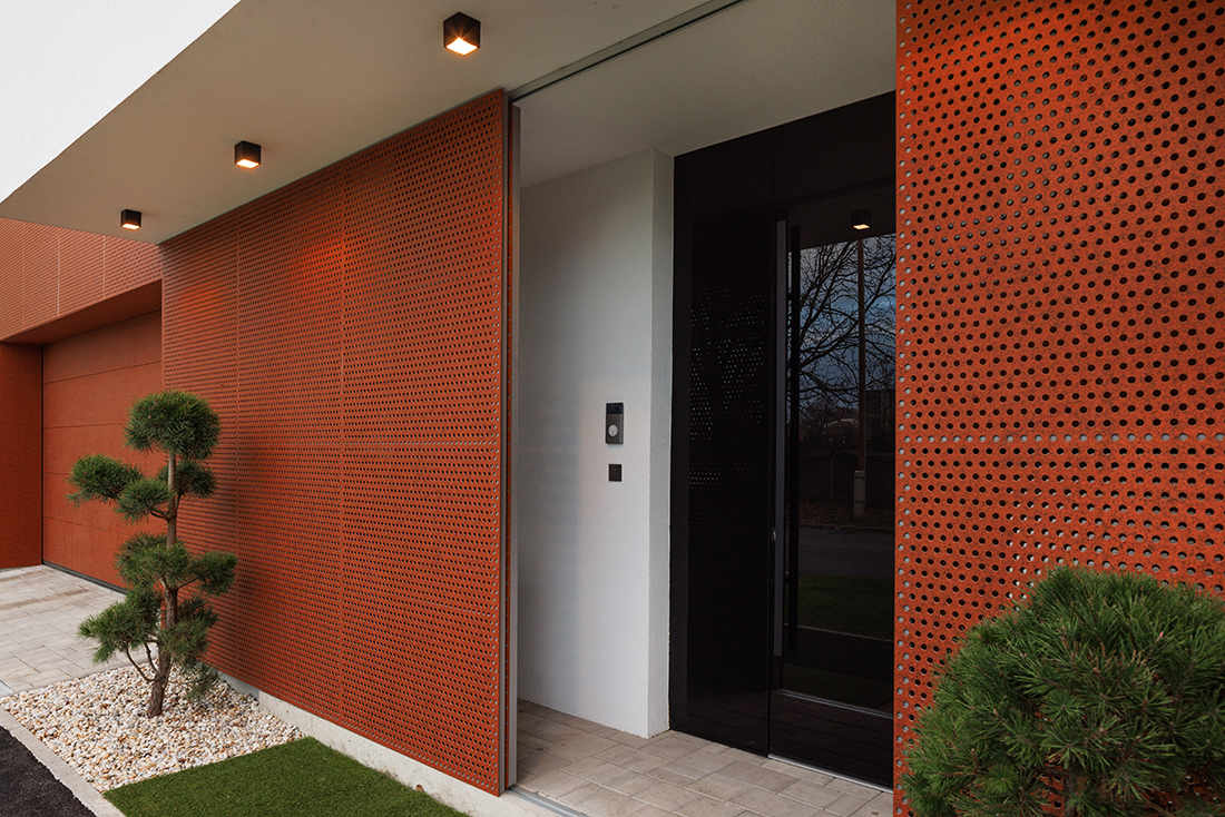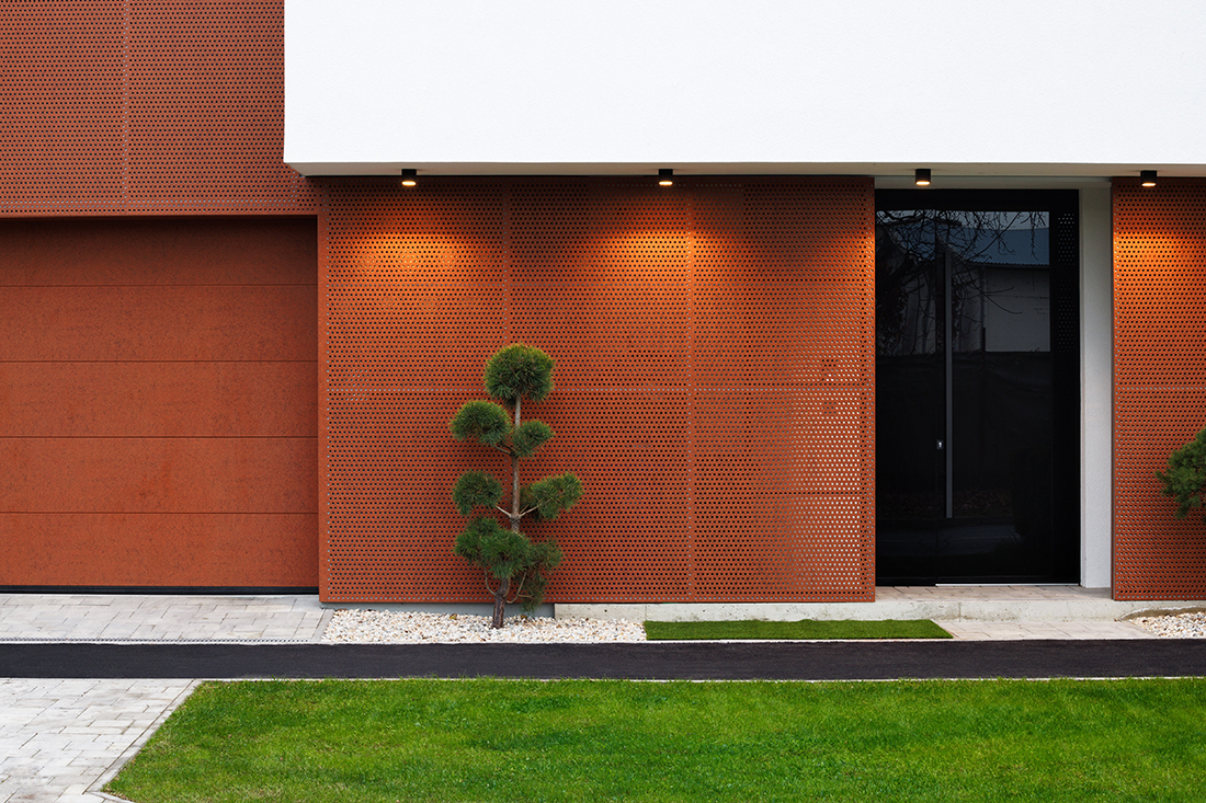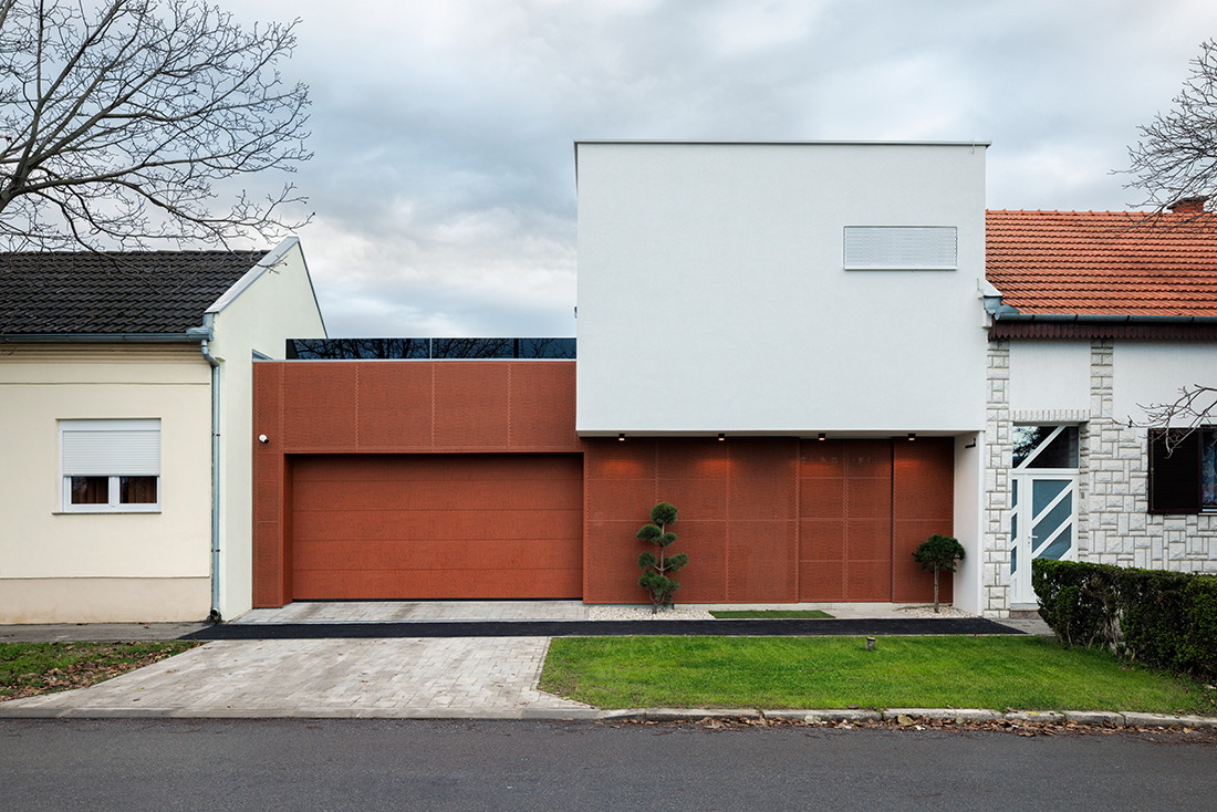 A small plot on a busy street posed a great challenge. It was essential to accommodate all spatial needs, ensure privacy and intimacy, create a green courtyard as an extension of the open-space living area, and find room for a terrace, a space for the car and motorcycle. All of this had to fit into a small plot surrounded by existing buildings.
