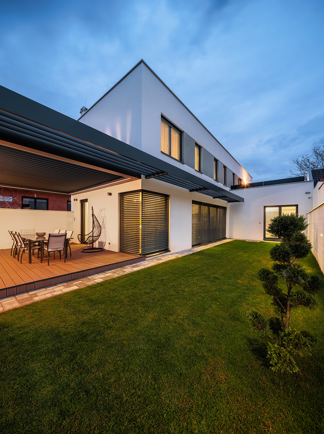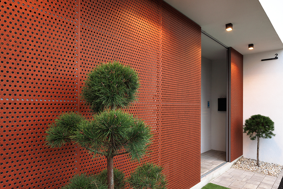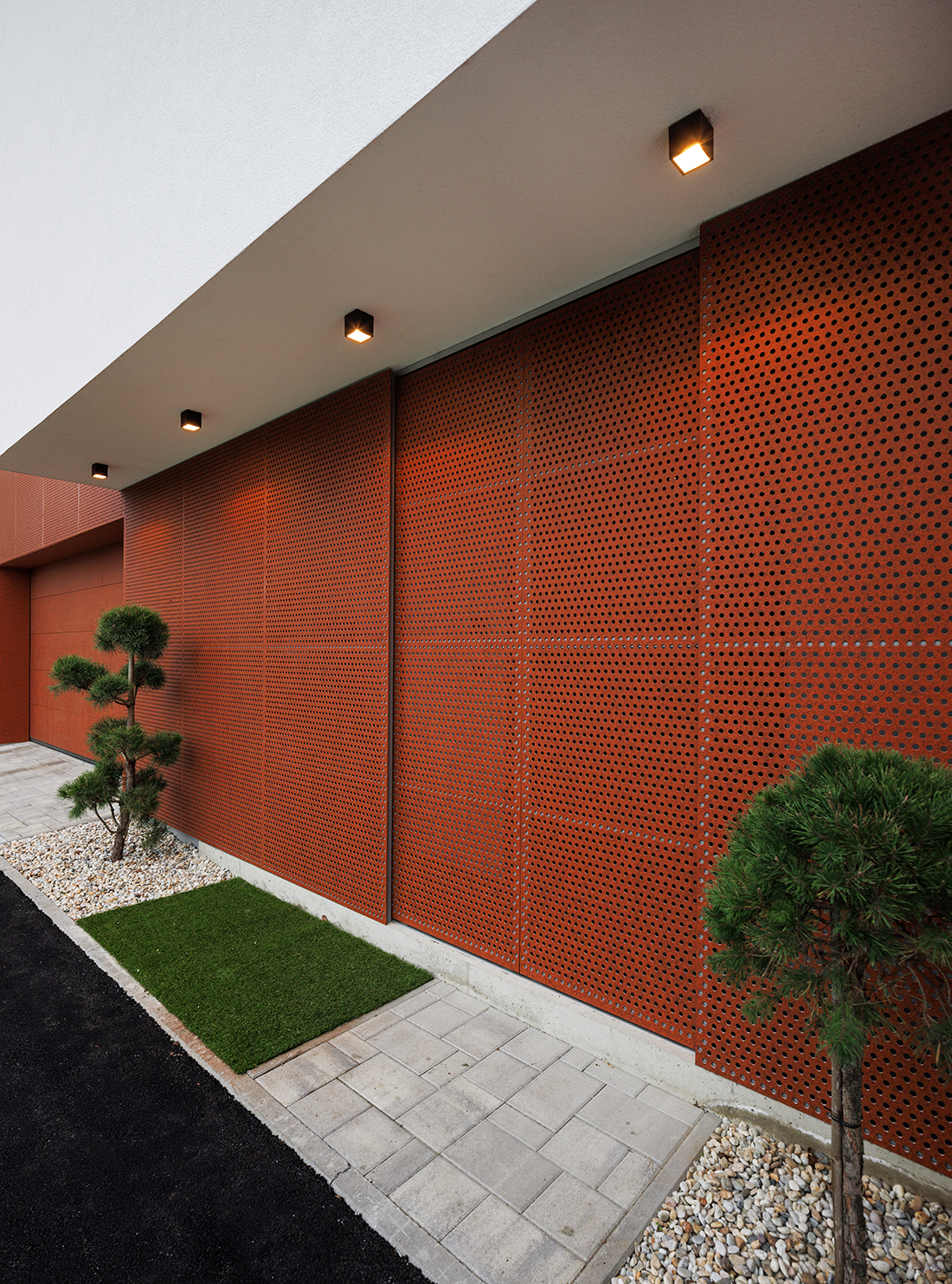 A small plot on a busy street posed a great challenge. It was essential to accommodate all spatial needs, ensure privacy and intimacy, create a green courtyard as an extension of the open-space living area, and find room for a terrace, a space for the car and motorcycle. All of this had to fit into a small plot surrounded by existing buildings.