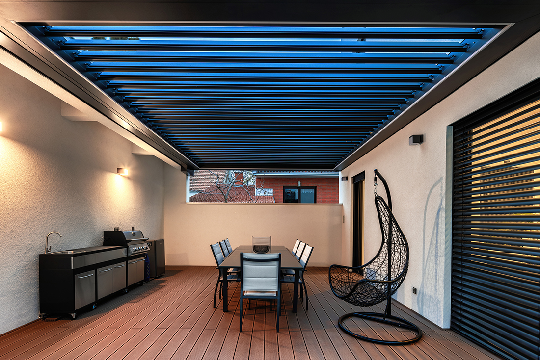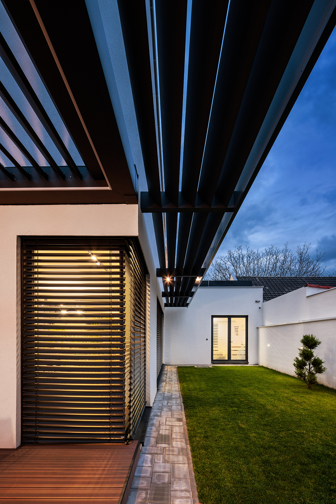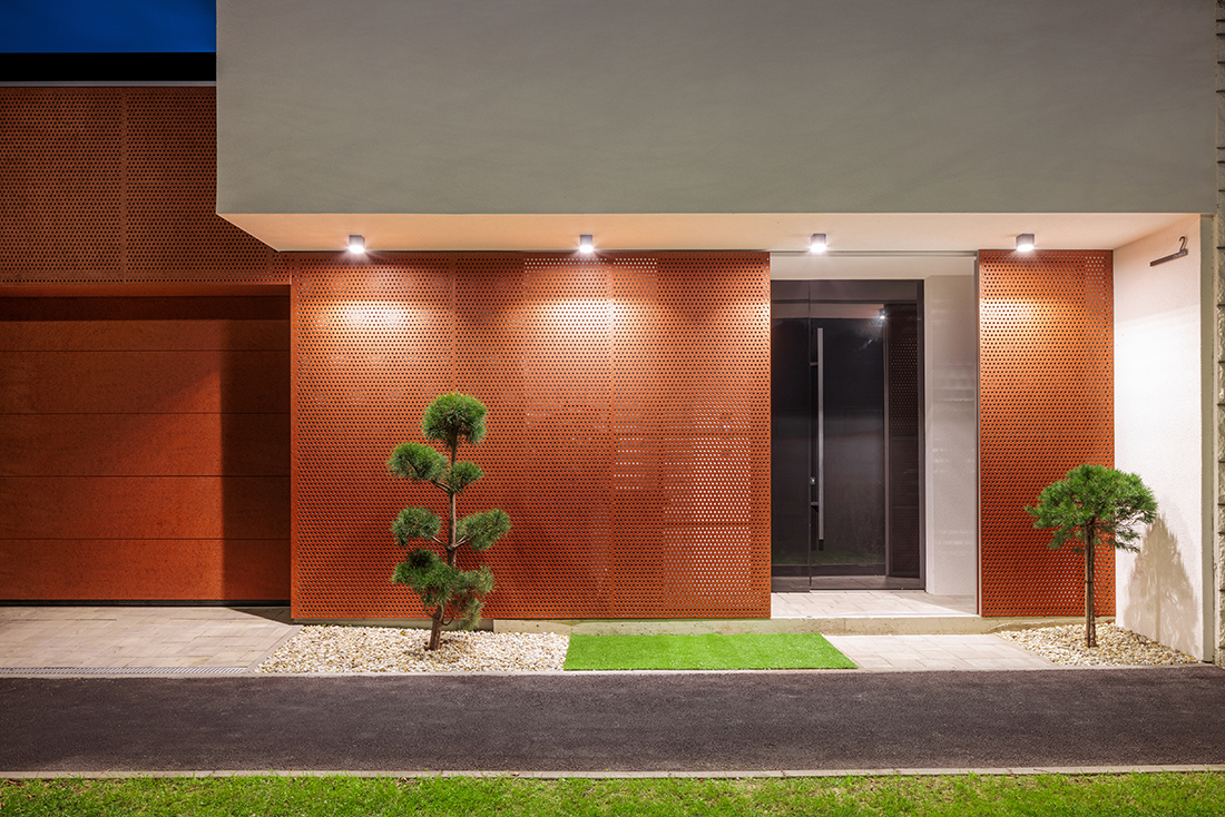 Due to the proximity to the street and passersby, we created an exterior shell that, when closed, conceals and further protects the entrance door – a slightly unconventional detail. We opened the house to the south, allowing sunlight to flood the courtyard and living area while ensuring complete privacy from curious onlookers.