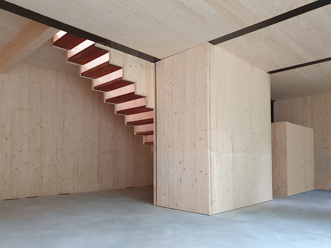 The structure is designed as a flexibly cuboid in golden ratio with 2 levels. The boundaries of the 6 m high hall are permeable and flexible, while the studio below is enclosed on 3 sides. The interior is formed by a solid wood construction, which makes this room acoustically comparable to a resonance chamber. The hall above, with all living functions, opens to the surrounding via glazed walls. Sliding wooden elements on three sides form a walk-in filter and provide privacy, sun, weather protection, and thermal insulation. The sensitive integration into the nature reserve creates the impression that the building has always been part of this landscape.