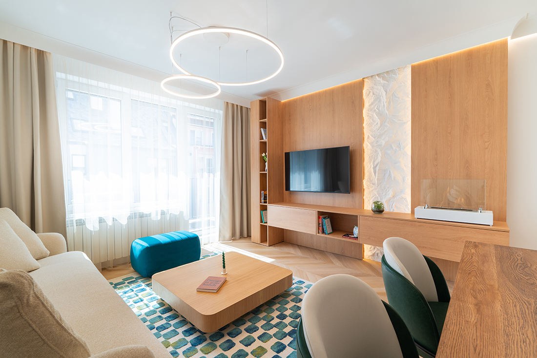 The materials used are natural, three-layer parquet and granite tiles on the floor. The imitation of natural stone in the bedroom and in the living room are accent points in the interior, which are emphasized with hidden lighting. The built-in wardrobes in the hallway and the bedrooms are painted MDF, and a natural veneer insert on the doors, which is slightly rounded for ergonomics. The bathroom furniture reflects its style in white and natural veneer. The textiles are selected according to the textures and color combinations. A focal point is the open space living room, where we have a bio ethanol fireplace. The lighting features in the apartment create a soft and intimate setting.