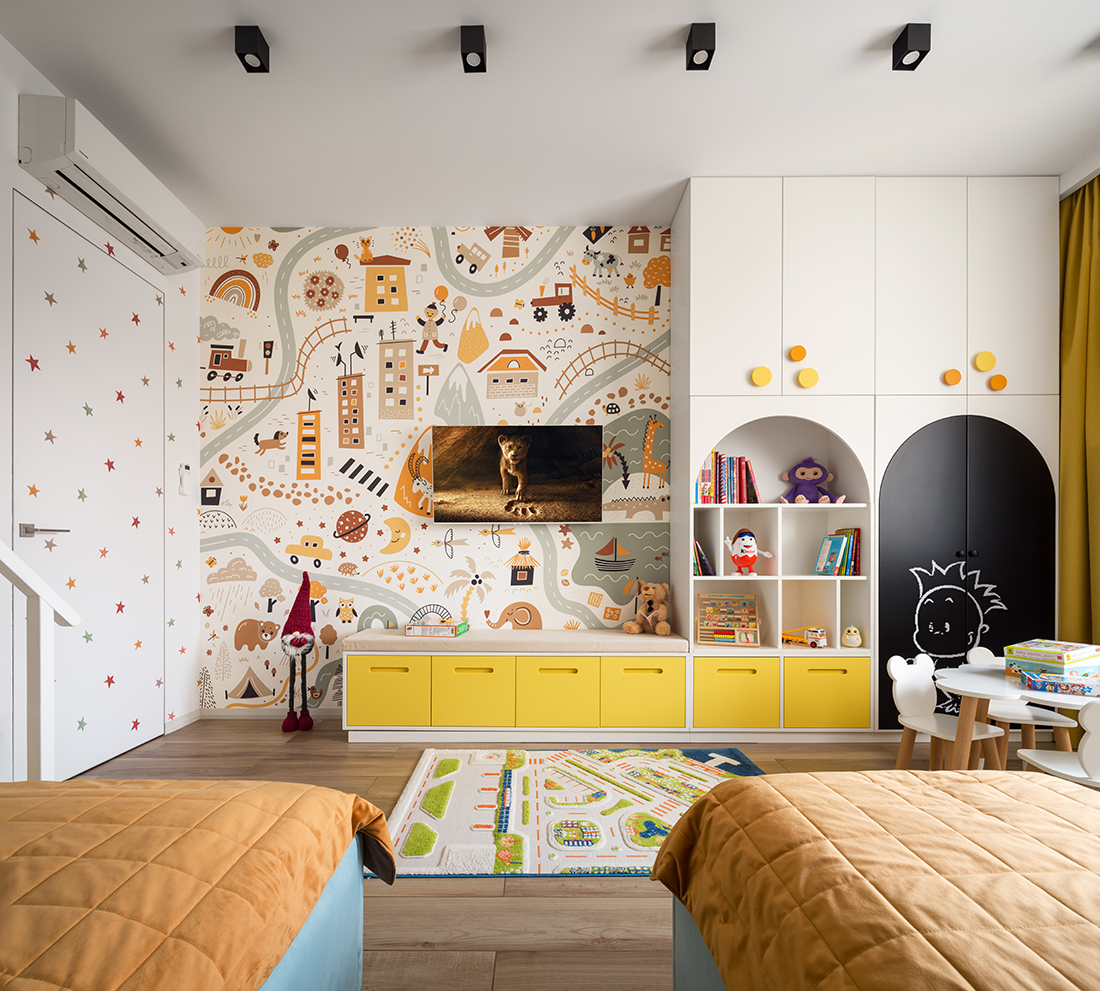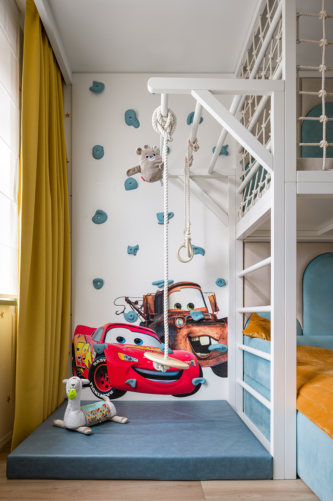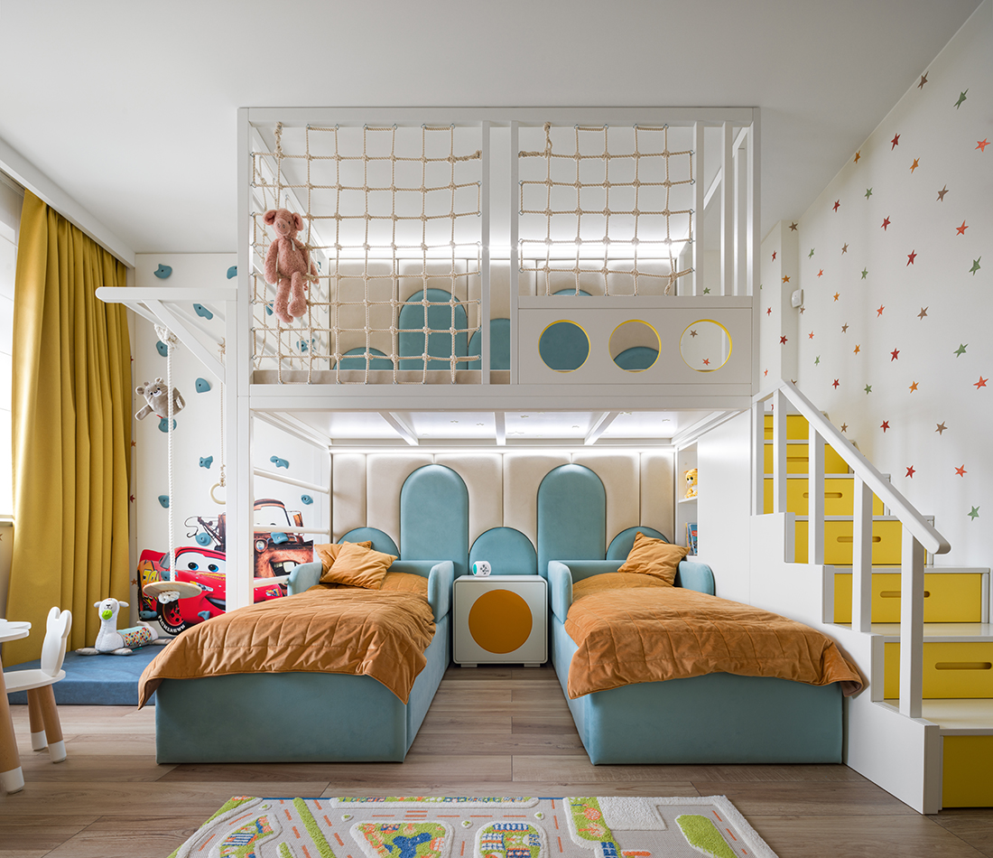 Here, they don’t just rest; they master independence and unleash their strengths – from creativity and artistic talents to athletic abilities, and even more. The heart of the room is our fabulous, two-story structure. It’s a cozy corner for relaxation, a platform for thrilling games, and the perfect spot for quality family time. And the rich color palette truly envelops the entire space in a magical, fairy-tale atmosphere.
