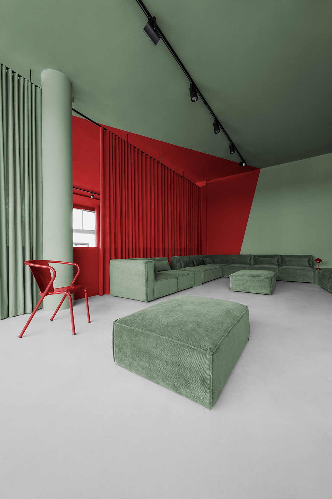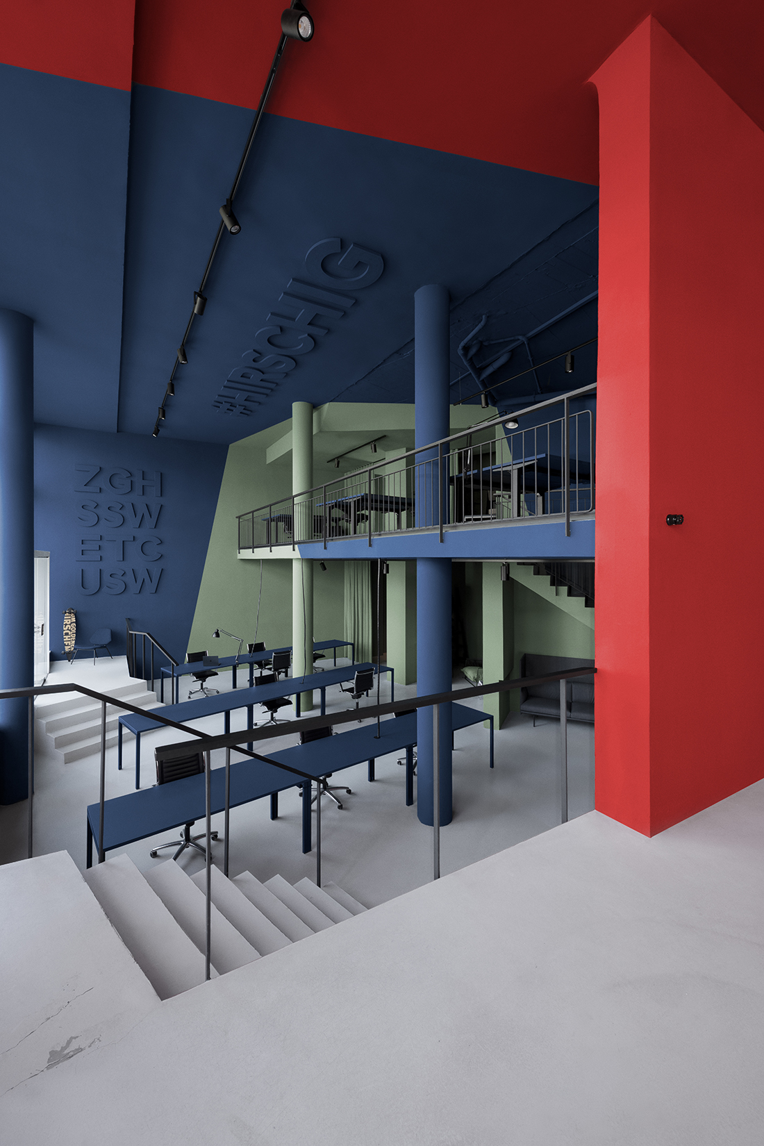 Flexible workstations are complemented by lounge areas, an integrated kitchen, and informal meeting spaces, creating a balanced relationship between concentration, exchange, and relaxation. A coherent color concept in red, blue, and green structures the space and marks different working atmospheres while visually unifying the partially double-height interior. Materials, furniture, and details follow a consistent design language. The architecture acts like a stage set, expressive yet functional, transforming the existing structure into an inspiring workplace that enhances everyday quality of life.