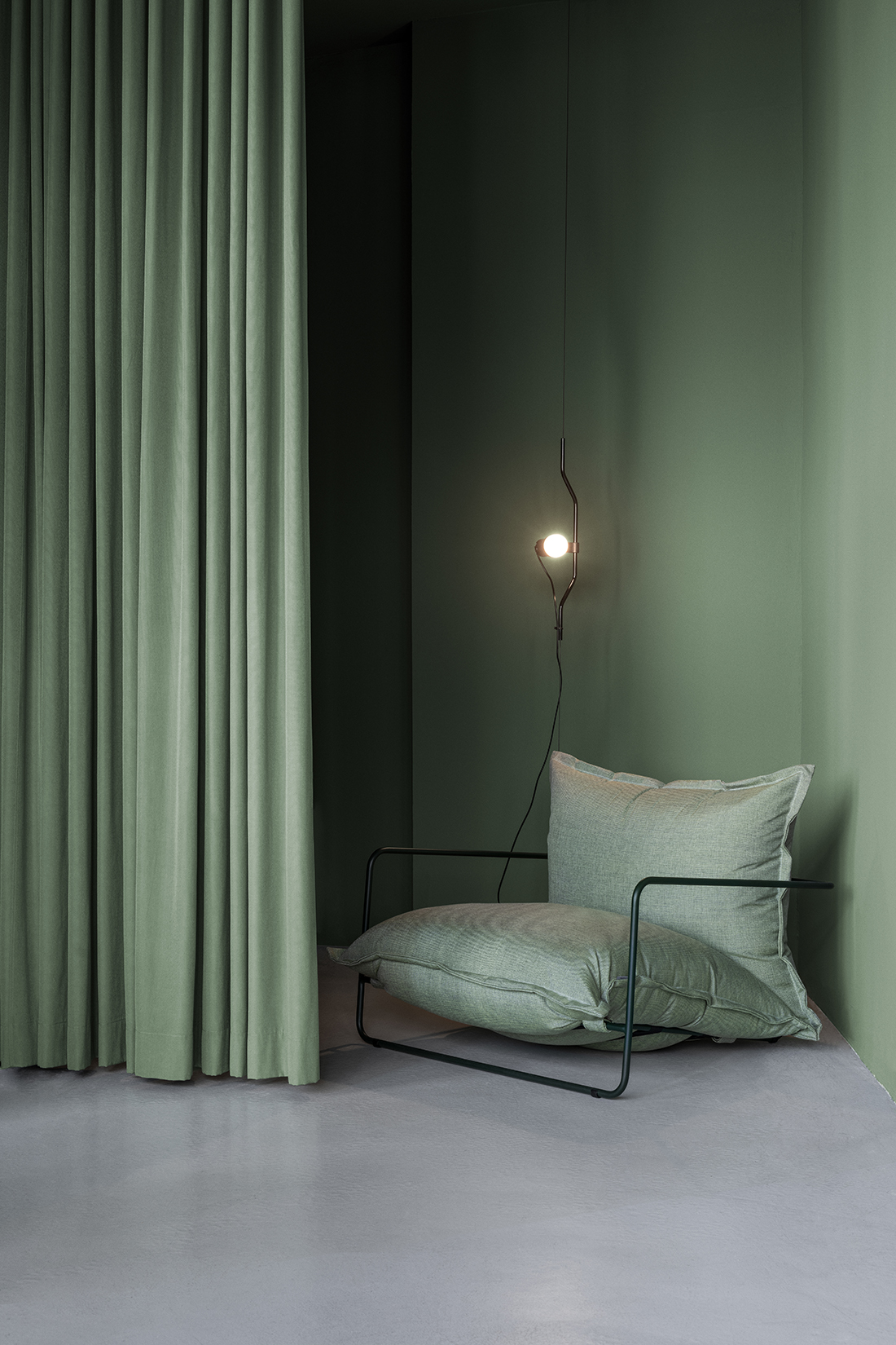 The renewed workspace is defined by a distinctive architecture. The fan-shaped, open-plan space unfolds across multiple levels, offering generous spatial depth and visual connections. This layout provided the basis to rethink the office as a hybrid of work and living. The design preserves the openness of the space while introducing clearly defined zones for focus and retreat.