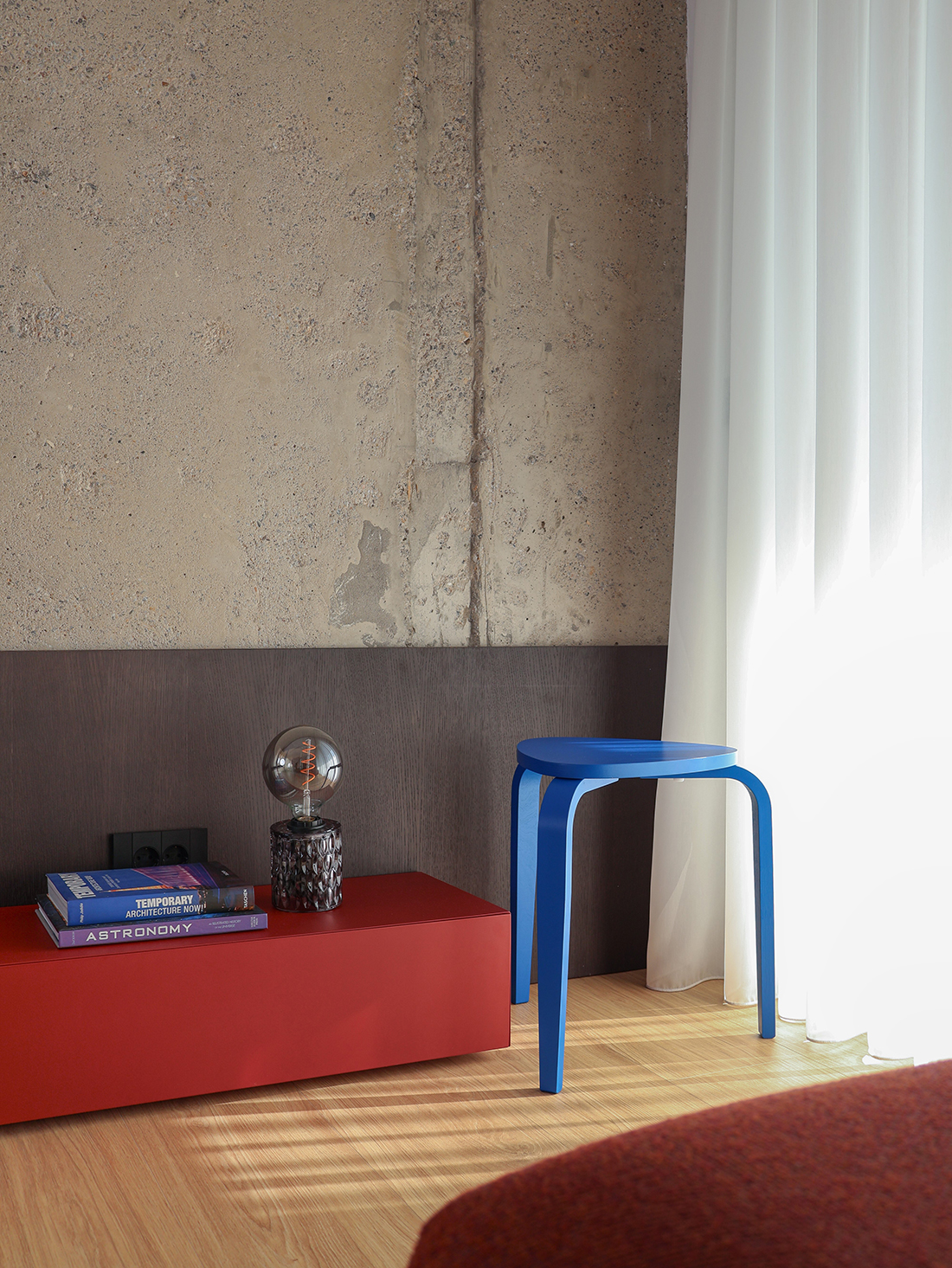 All-white surfaces enhance spatial purity, while exposed concrete, wood, stone, and brass form a tactile dialogue. Brass adds drama and luminosity. Subtle red and blue accents activate emotion. Material honesty, soft lighting, and quiet elegance define this introspective, timeless space of presence and memory.