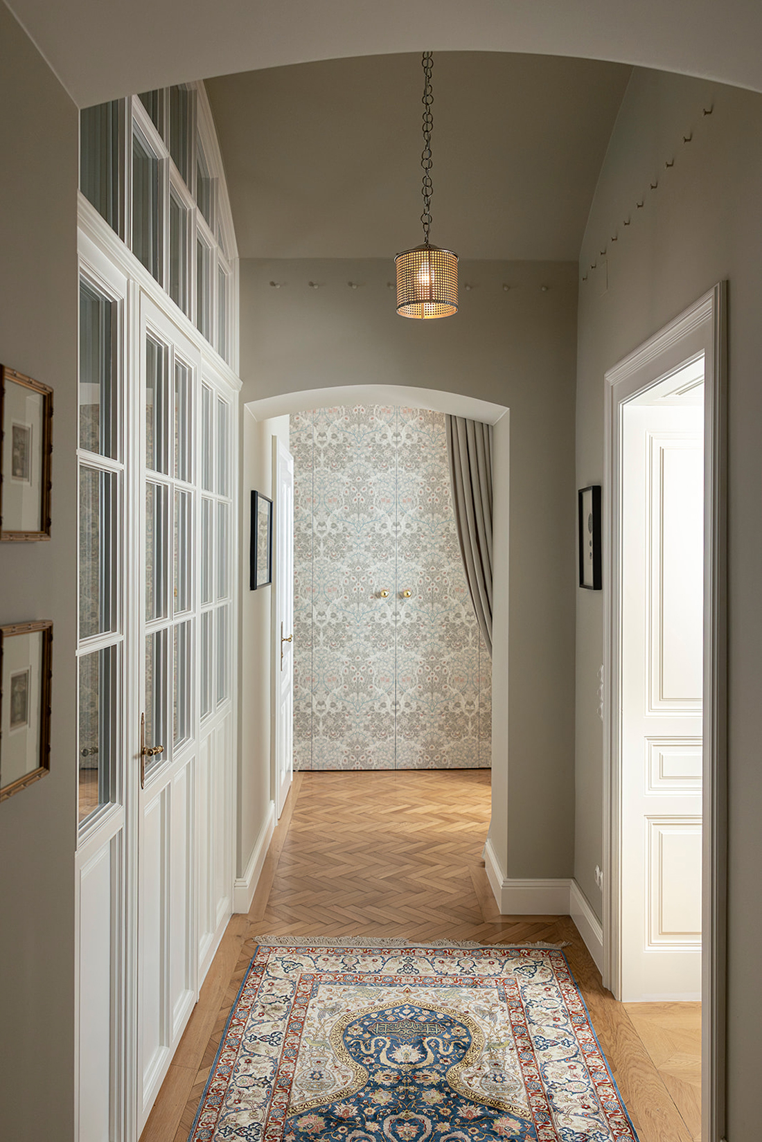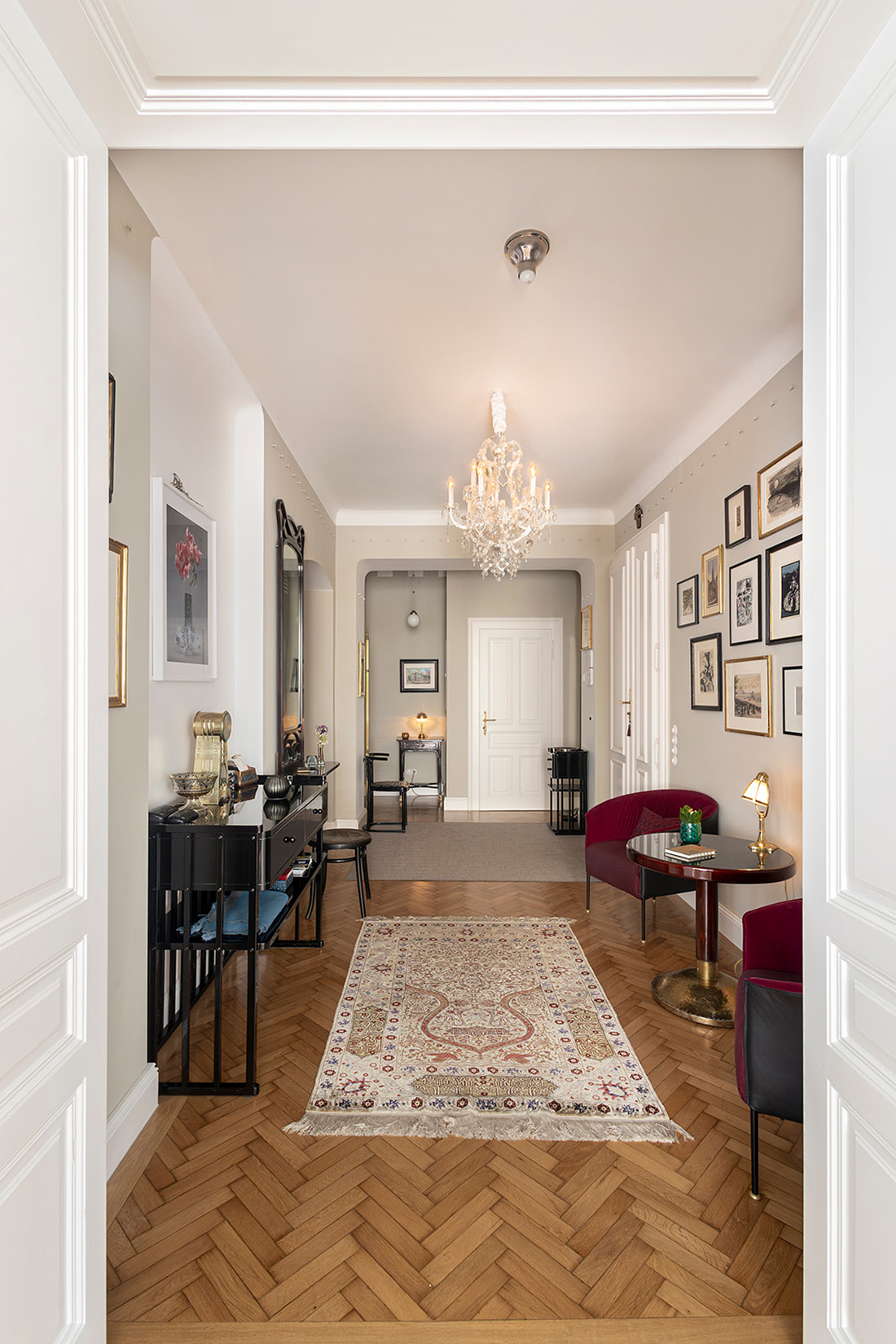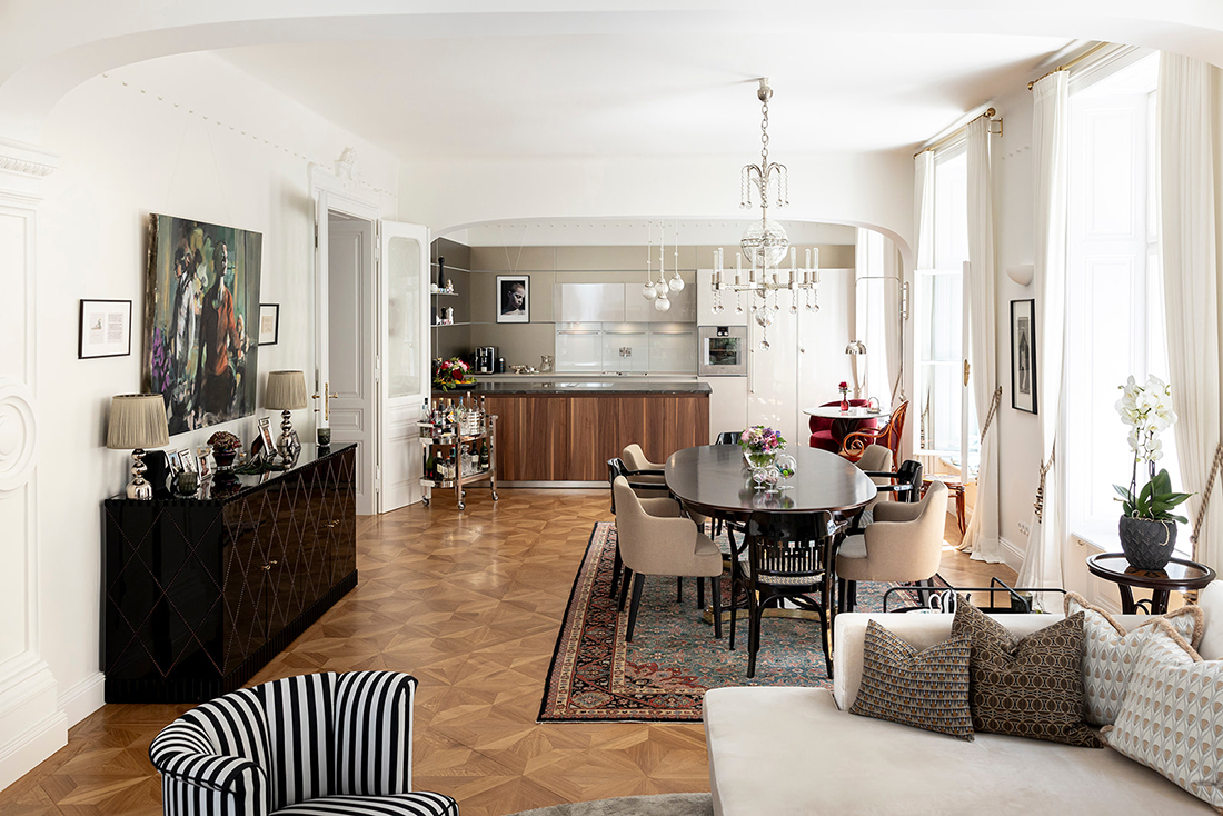 The historic character of the apartment and building, along with the spirit of Vienna and the Jugendstil era, has been carefully restored. Original elements were authentically rebuilt and reinterpreted in a contemporary way. Invisible heating-and-cooling ceilings replace radiators and air-conditioning units.