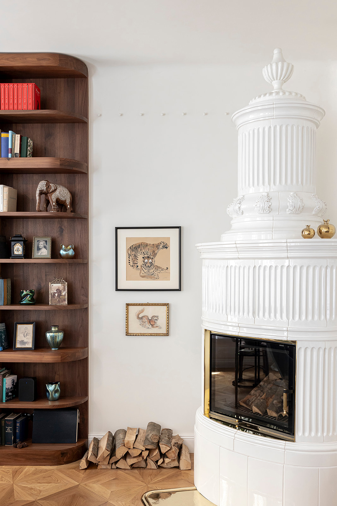A new star parquet complements the restored herringbone floors, while hand-drawn cove moldings revive the elegance of past epochs. A hand-crafted, historic tiled stove serves as a centerpiece. Bathrooms feature artisanal cement tiles, with fine marble in the second bath. Some furnishings are original Jugendstil pieces, adding historical depth. Windows and doors were reconstructed true to the originals, allowing the splendor of a bygone era to shine again in a modern, refined form.
