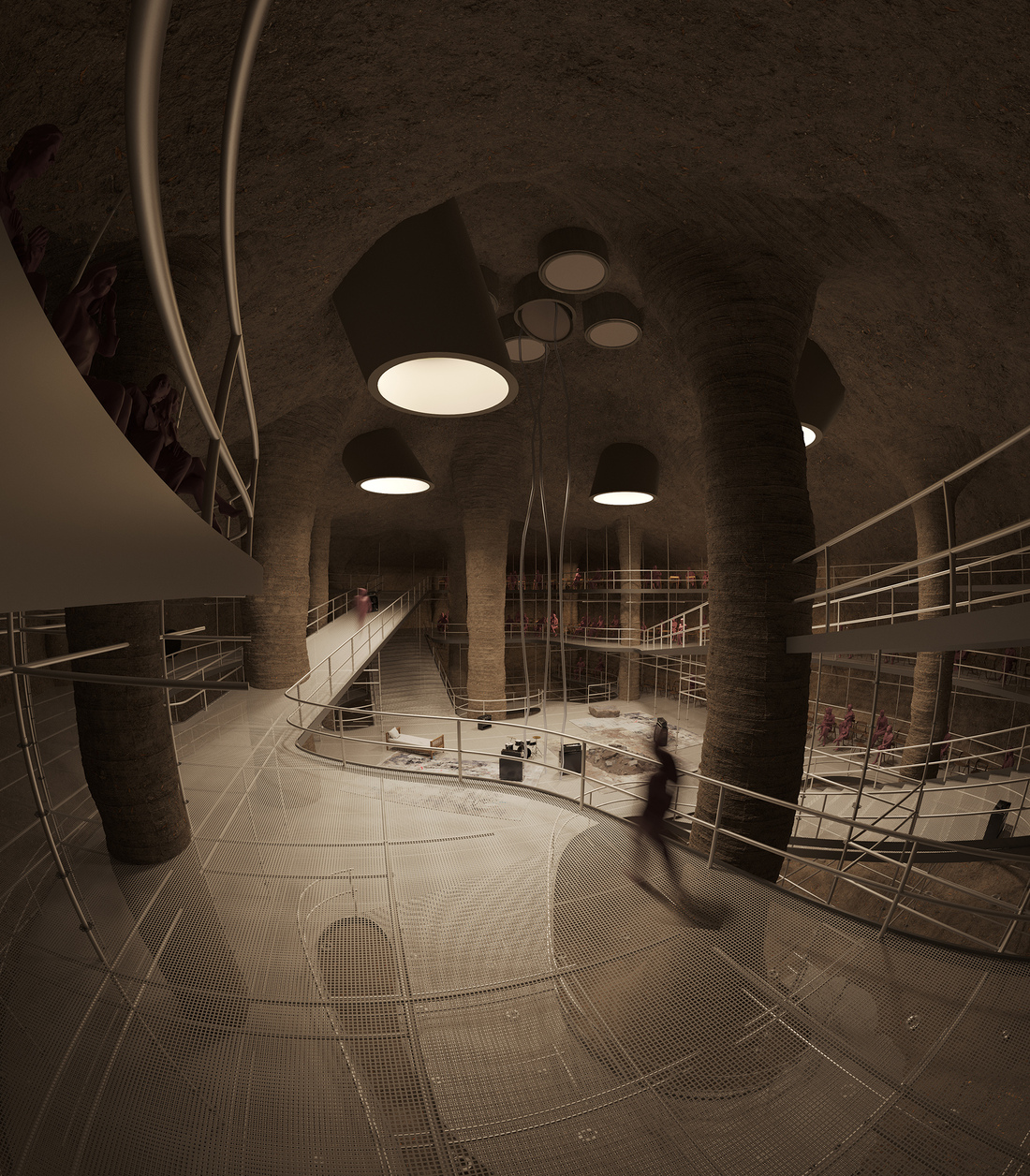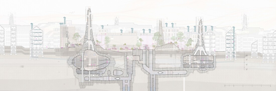 the Breathing Ground is the master thesis project of Anna Orbanic. It is a research and design project that explores breathing systems and develops a ground-bound building for the time of extreme climate. The building - through its shape, physiology and vertical extensions - is seen as a climatic apparatus, providing a new public space underground, where temperatures remain stable throughout the year.