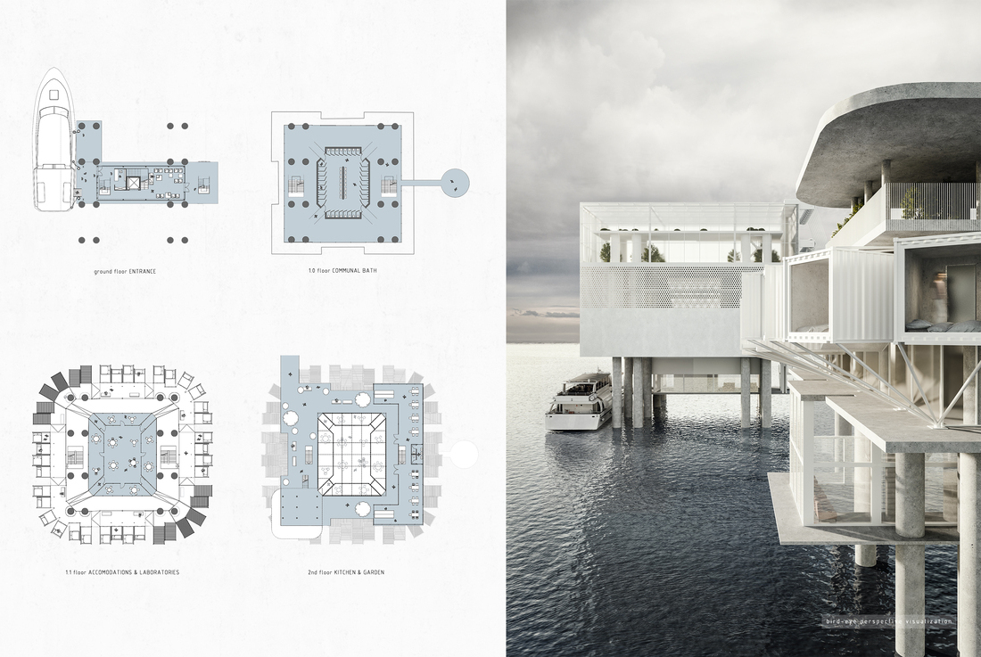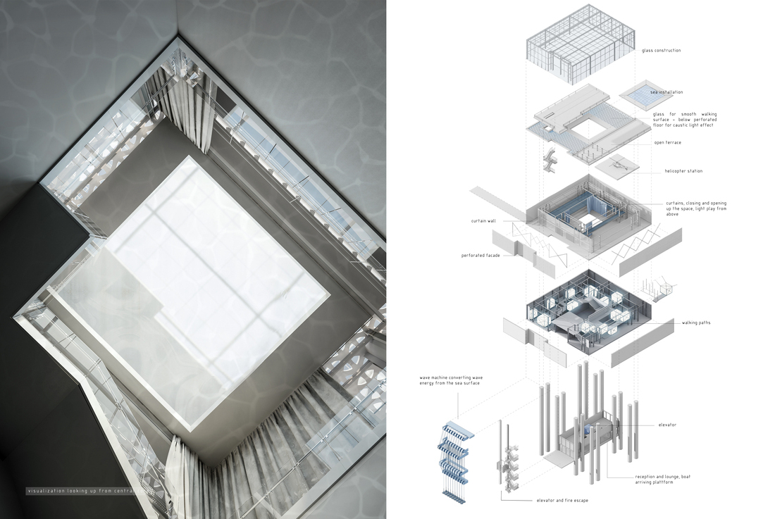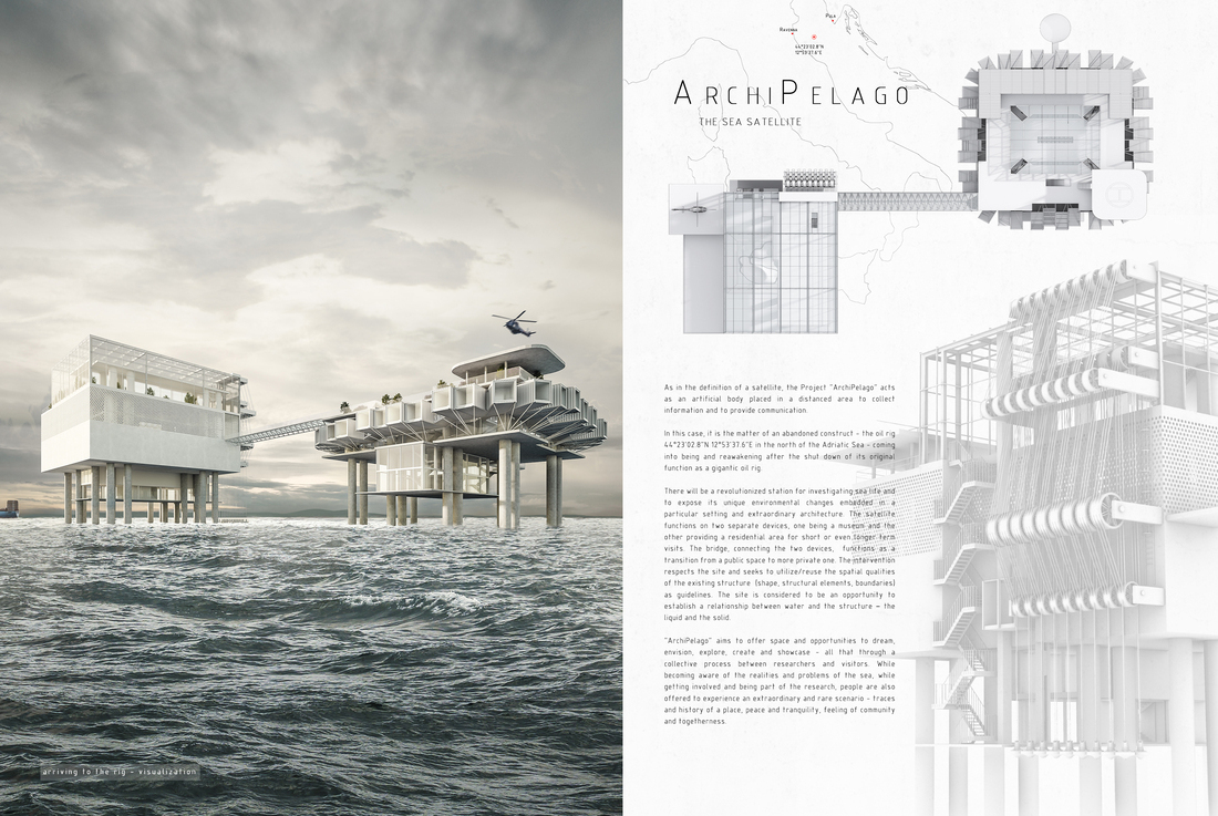 It is a speculative adaptive reuse project that reimagines a decommissioned oil rig in the northern Adriatic Sea (44°23'02.8"N 12°53'37.6"E) as a satellite for ecological research and cultural exchange. Like an artificial satellite in orbit, this sea-based station gathers, shares, and amplifies knowledge—serving both as a site of investigation and a platform for communication.