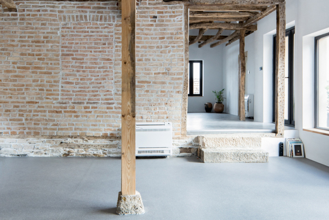 The new configuration of the residential part is directed by the original layout . Living spaces are crafted with light and a combination of cohesive materials aiming to create a visual canvas, highlighting the preserved elements and textures of the historic house.