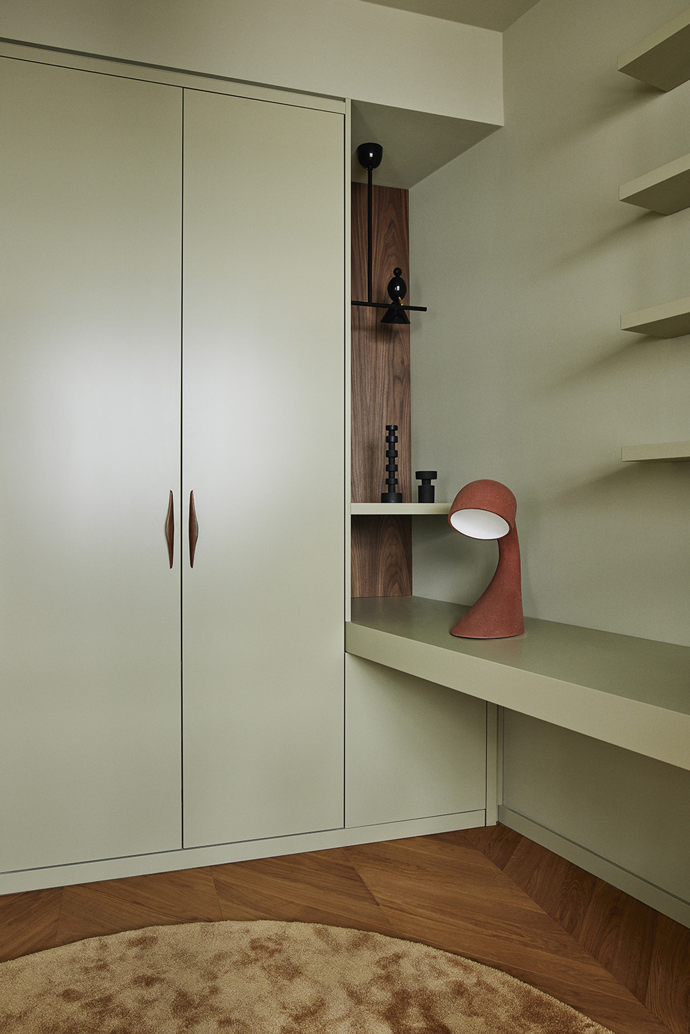 The Phoenix project development in Berlin-Charlottenburg is an existing building from the 1920s. A wonderful setting for a show flat. They set themselves the goal of translating the spirit of this vibrant decade into a contemporary interior and creating a functional home. The biggest challenge in the project was the design of the floor plan and the development of the space program, as the supporting structure, the sloping exterior wall and the relatively low ceilings needed a lot of creativity to design something spectacular. But the idea was that anyone can do simple and they transformed the apartment into a special place for a family. It was important to give each room a quality. The motto of the 20s should not be dogmatically in the foreground, but the functionality and well-being. And they wanted to have an answer to every functional question. Every niche is used and designed in a sophisticated way. The apartment should become a strong and expressive character that you get to know more and more. The material and color concept should be unusual for a project development that is basically oriented to a black and white mass taste. Therefore, the result is dedicated to the pure joy of life and the good life. The material world should be honest and sustainable and age perfectly. Nothing that would have to be replaced or exchanged again in years should be built in. Durability in times that are not durable. Sustainability in a beautiful, perhaps a little dreamy packaging.