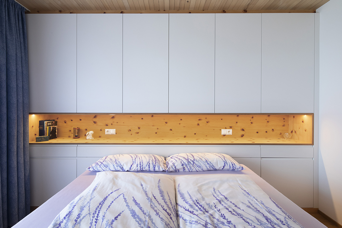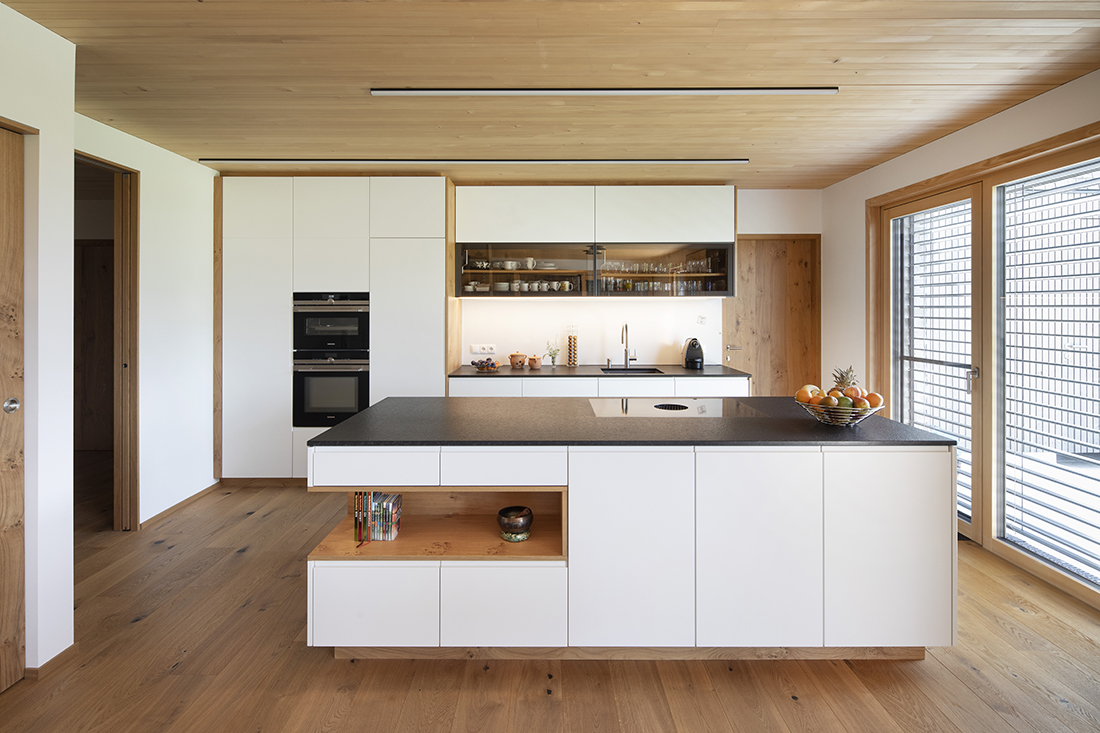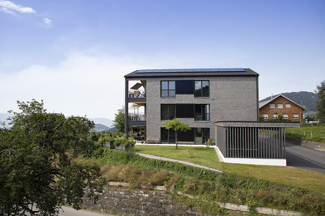 The ground floor includes a garden apartment for the builder’s mother, allowing her to maintain her garden and enjoy the terrace. The upper floor mirrors the layout of the garden apartment and features a generous terrace. The attic loft provides an exceptional view of the Rhine Valley. The building is clad in gray vertical fir wood paneling, treated with products like Adler Pullex Silverwood. A rooftop photovoltaic system, excellent insulation, and geothermal heating ensure sustainable operation, combining modern architecture with ecological principles.