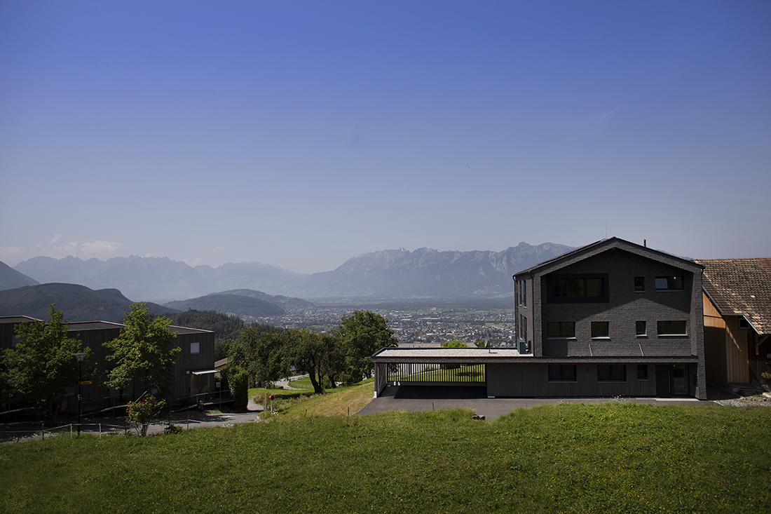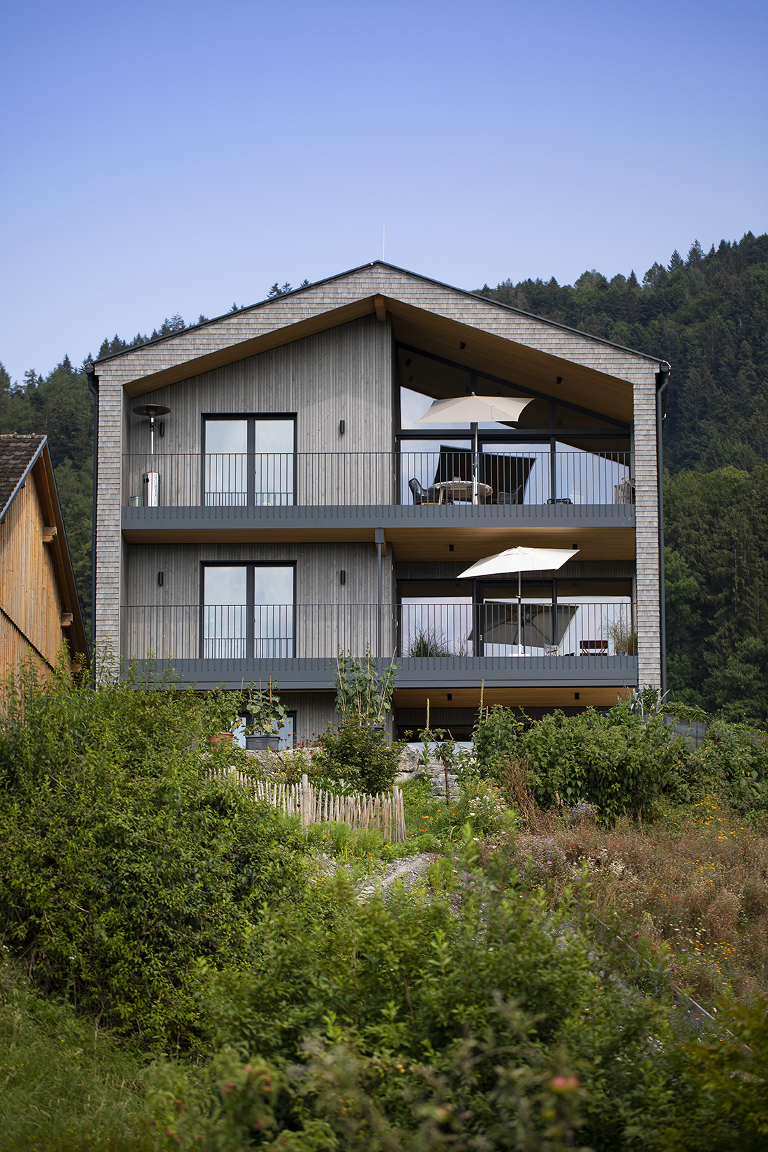 A modern residential complex is emerging in the picturesque Rhine Valley, replacing an old residential building, while the adjacent barn remains intact. This sustainable wooden structure reflects the new conditions. The compact design features a simple gabled roof and is accessed from the east on the ground floor. A west-facing terrace offers stunning views of the Rhine Valley and the surrounding nature.