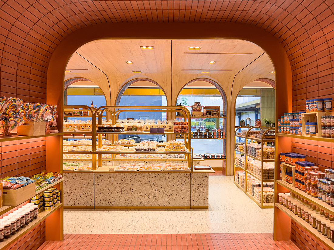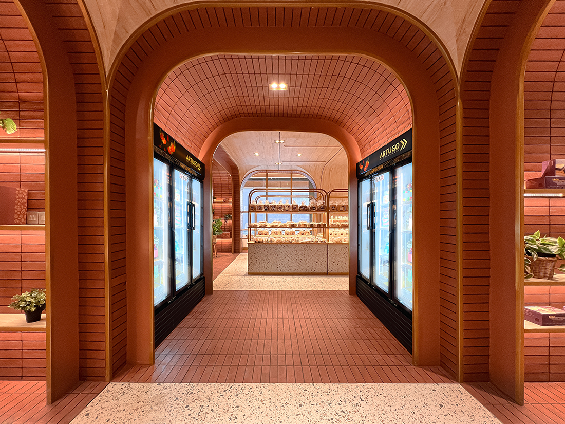 These architectural elements optimize sunlight while protecting bakery products. Zoning uses portals for display and flow, guiding customers through sequential spaces to the main pastry area. The interior contrasts bright red, brick, wood, and stone, bending these rigid materials into fluid arches. Due to limited local expertise, the bakery was fabricated in Jakarta, shipped, and assembled in Jayapura in four weeks. Since reopening, profits have risen by 50%, and Saga Bakery is now recognized as a modern city icon.