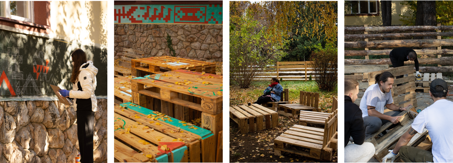 Addition of urban amenities - places to sit or lay down, trash receptacles and lighting. The installation is made out of reused wooden pallets, low-tech and low-budget. It has a possibility to be moved and put in different formations for larger groups or to be used individually.