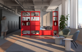 The 40 m2 has a central black box in the middle that creates 5 different areas; every single side is part of a particular area in the Shelter. The sliding doors in the corners create more space and the different areas can be totally divided. Thanks to the extra module on top we have more incoming light from above for the entrance. The left part of the box works as a kitchen and a relaxing zone, the back of the box has a shower and a sink next to the window. Next to the bathroom we have the big bed and the jacuzzi. The extra module on top is another bedroom that you can also easily turn into a relaxing mediation zone.