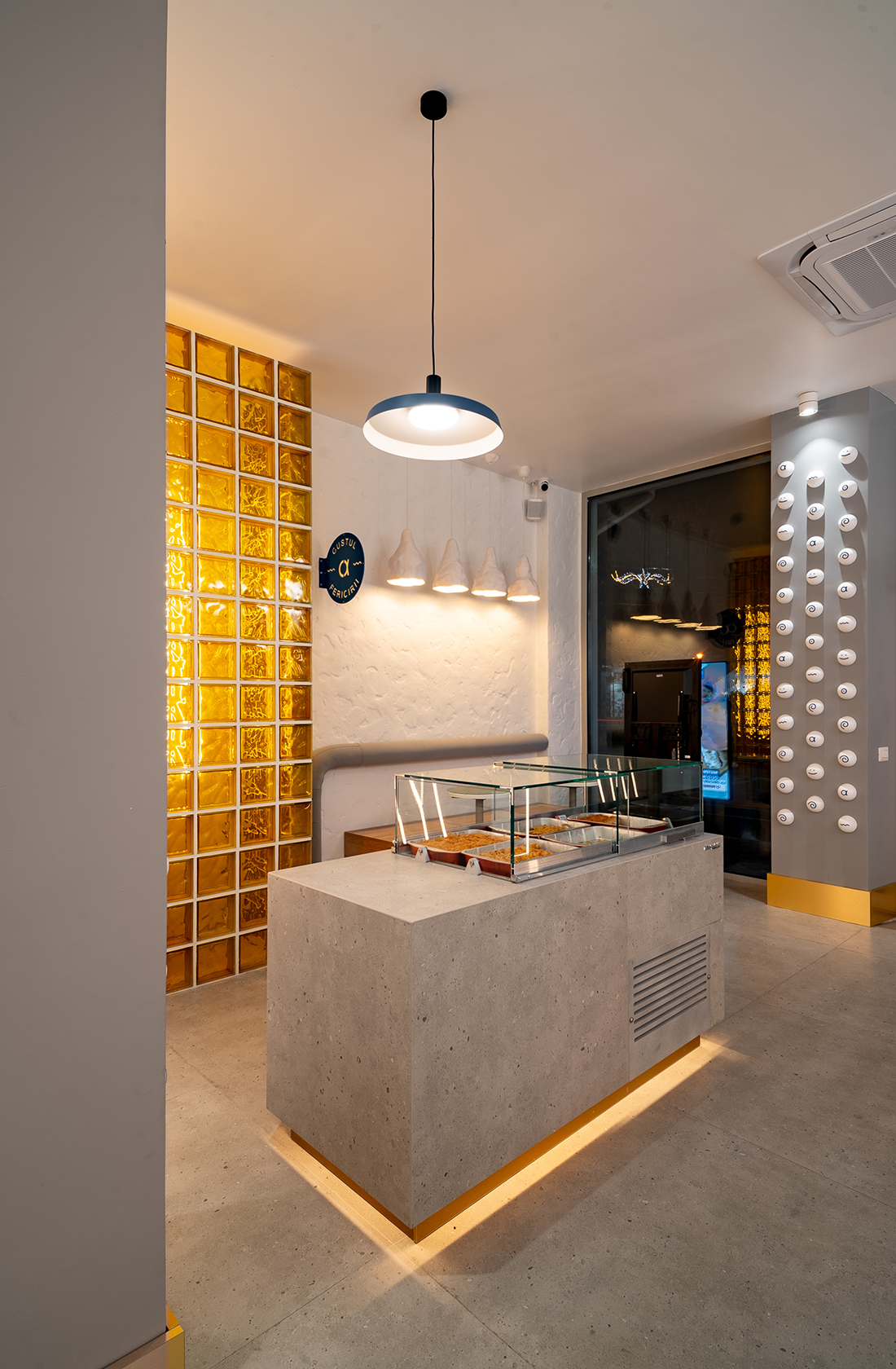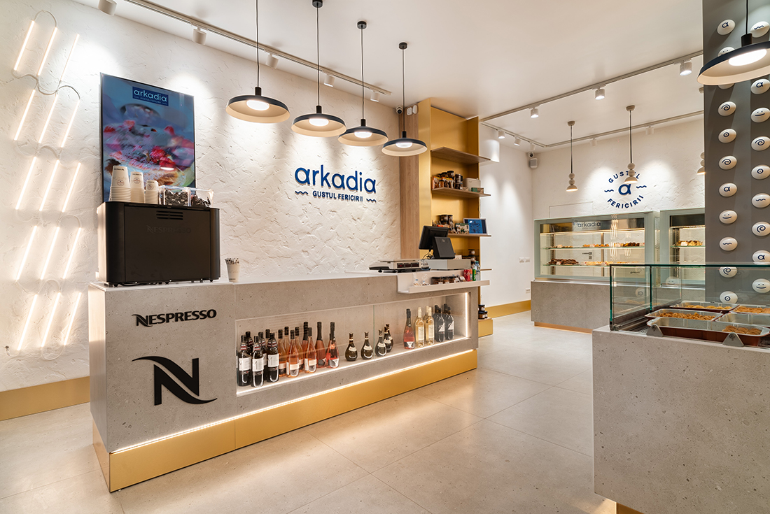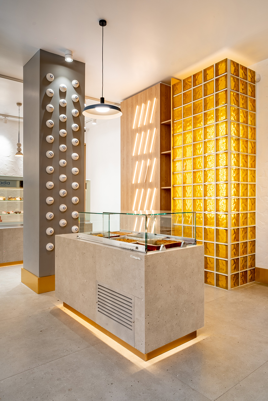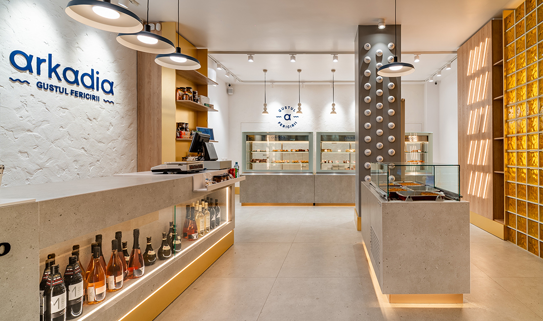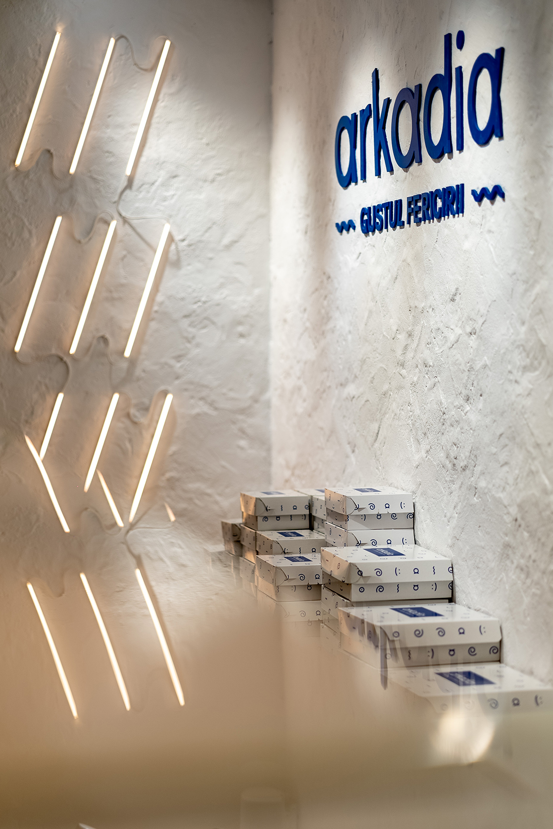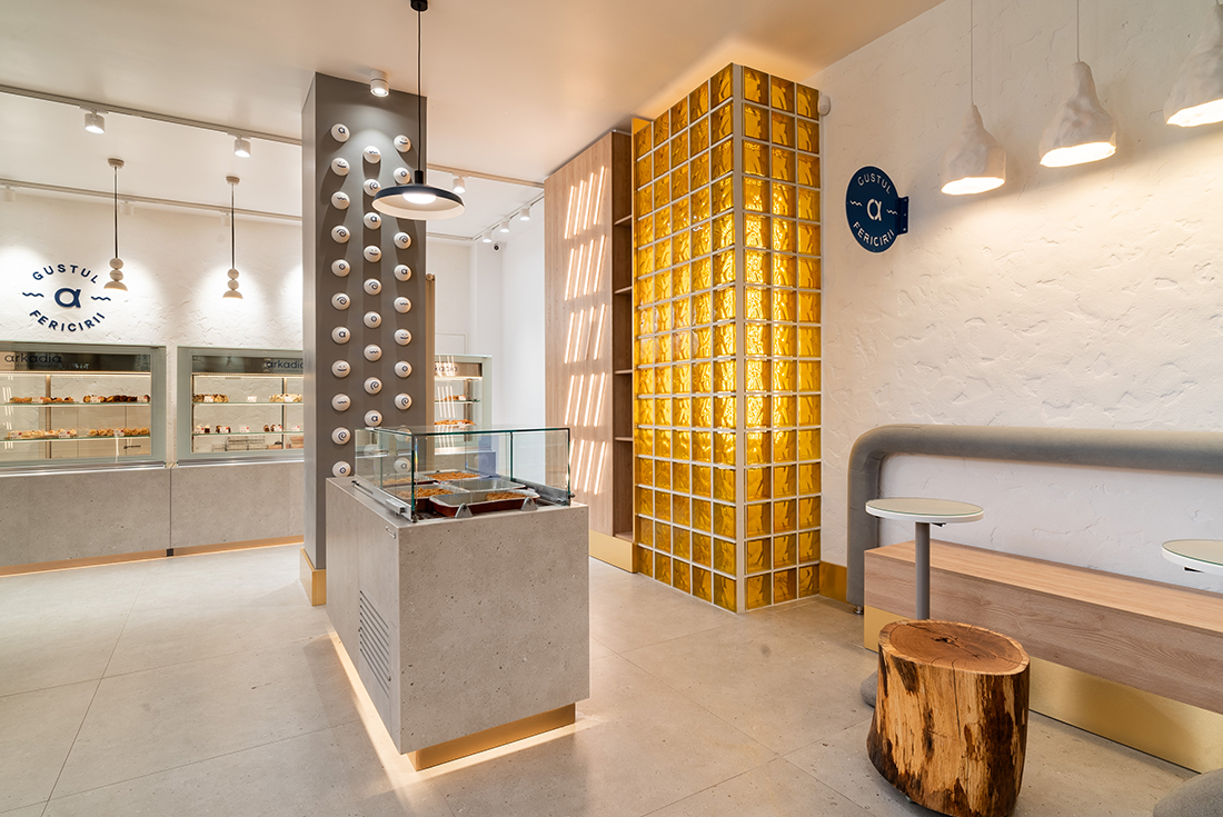 “The Taste of Happiness” is the concept behind the design of the Greek-themed pastry shops Arkadia. We found an equivalent for happiness through the concept of the sun, which provides light, warmth, and cheerfulness, just like a sunny day. The sun, symbolizing happiness, is represented through light. Behind a yellow glass brick wall – the color of the sun, happiness, and optimism – LED bars create an image reminiscent of sweet syrups. Additional LED bars form a pattern of diagonals, symbolizing sunbeams.