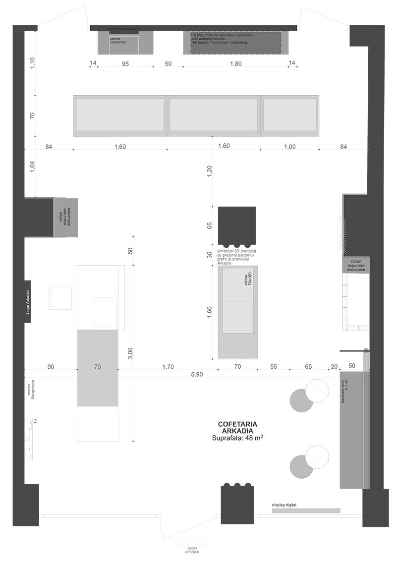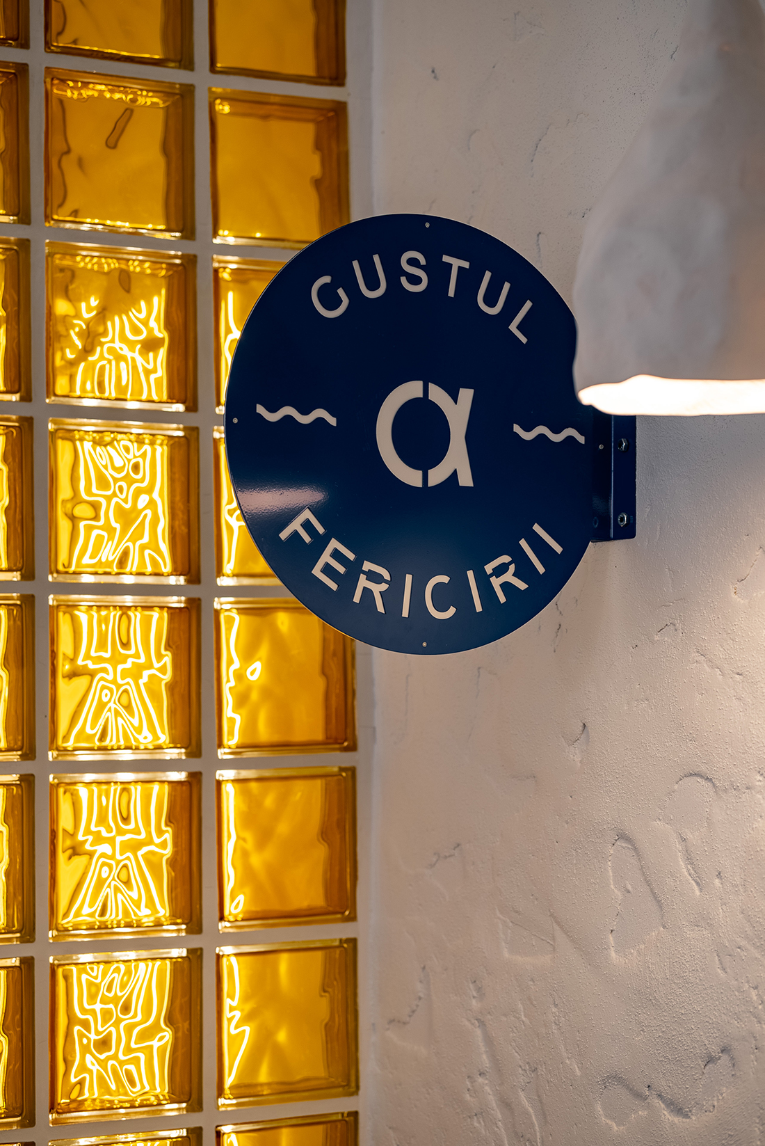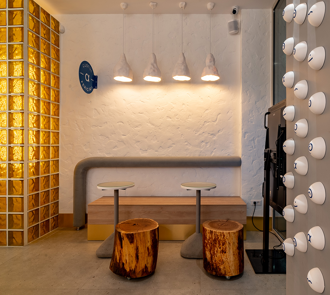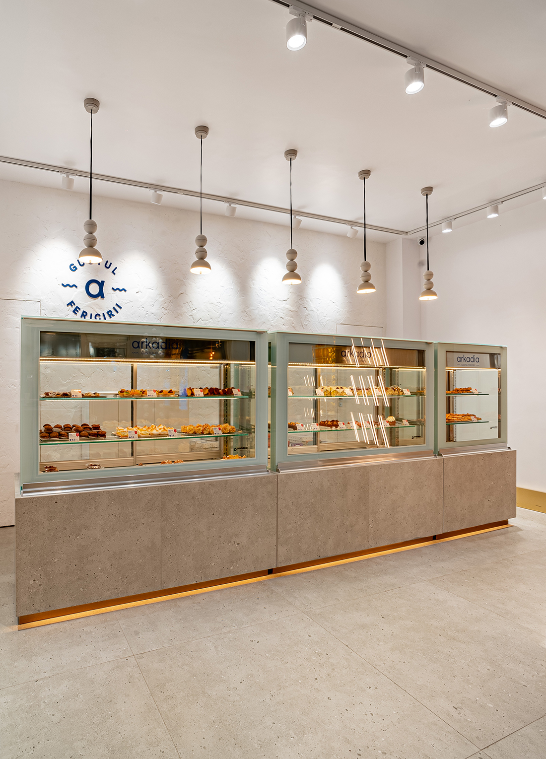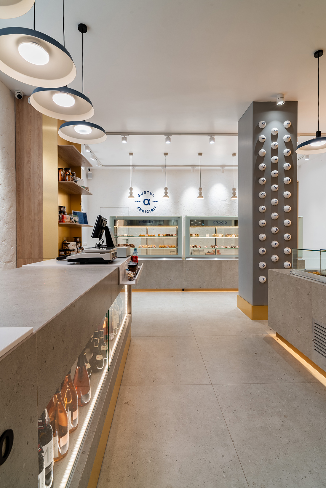 “The Taste of Happiness” is the concept behind the design of the Greek-themed pastry shops Arkadia. We found an equivalent for happiness through the concept of the sun, which provides light, warmth, and cheerfulness, just like a sunny day. The sun, symbolizing happiness, is represented through light. Behind a yellow glass brick wall – the color of the sun, happiness, and optimism – LED bars create an image reminiscent of sweet syrups. Additional LED bars form a pattern of diagonals, symbolizing sunbeams.