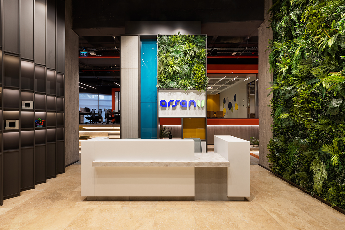 The Arsan Kimya Office emerges from a shell-and-core space, characterized by a two-level configuration and the generosity of a six-meter ceiling height. The project embraces this spatial potential through a precise architectural transformation that preserves the vertical openness, while inserting a mezzanine to accommodate social and collaborative functions within the double-height volume.