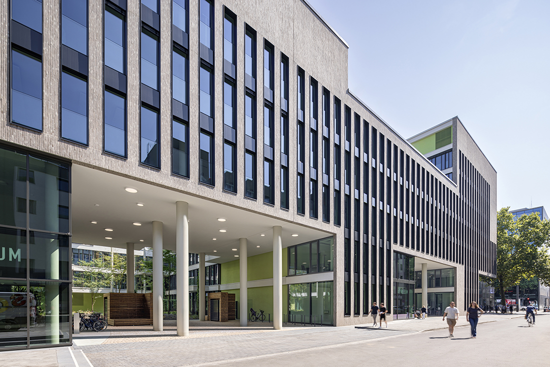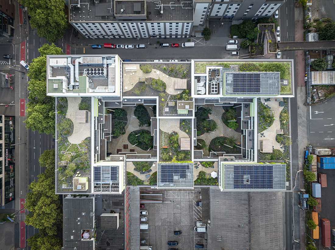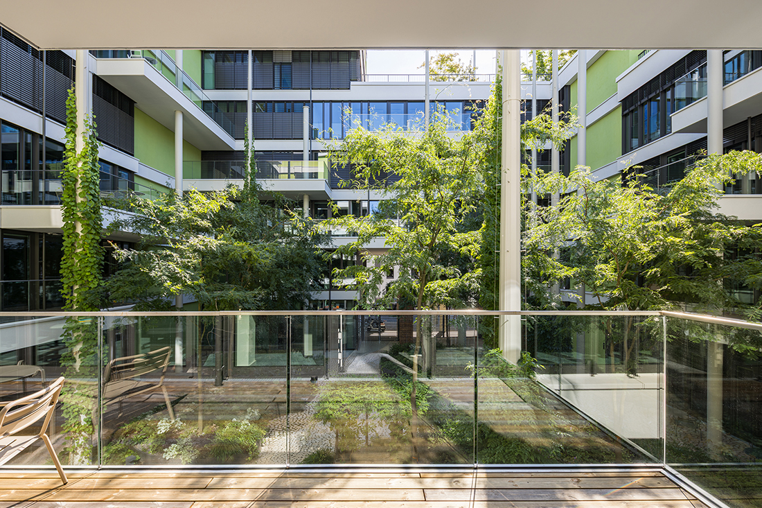 Numerous balconies and roof terraces are oriented towards the inner green spaces and enable the use of these landscaped green areas. These green inner courtyards form the significant heart of the building. The roof terraces offer special recreational areas with pavilions and workspaces surrounded by greenery. A retention and evaporation concept is integrated into this overall concept, which creates a healthy, natural microclimate in the courtyards and inside the building. In this way, this building can make a contribution to sustainable architecture.