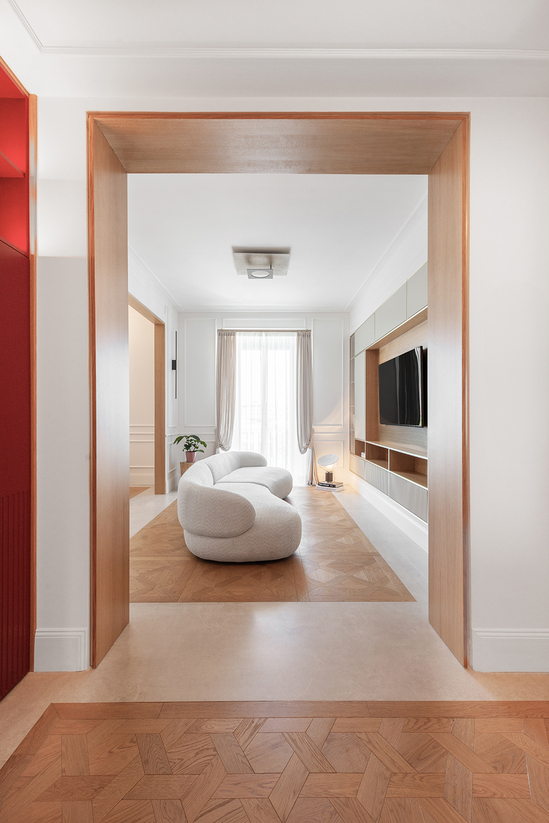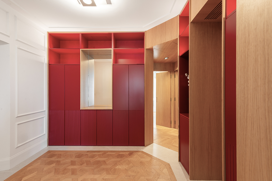 From the entrance, white boiserie interacts with wooden cabinetry and lacquered surfaces in deep tones, creating striking scenographic backdrops. The living area unfolds into bright, airy spaces, defined by geometric paneling and patterned parquet flooring that emphasizes spatial continuity. Custom furnishings – from the library framing the TV area to the dining table – reinforce the sense of a unified, tailor-made project. In the night zone, the palette deepens with ultramarine blue, highlighting the purity of forms and enhancing intimacy through light cuts and minimal fixtures.
