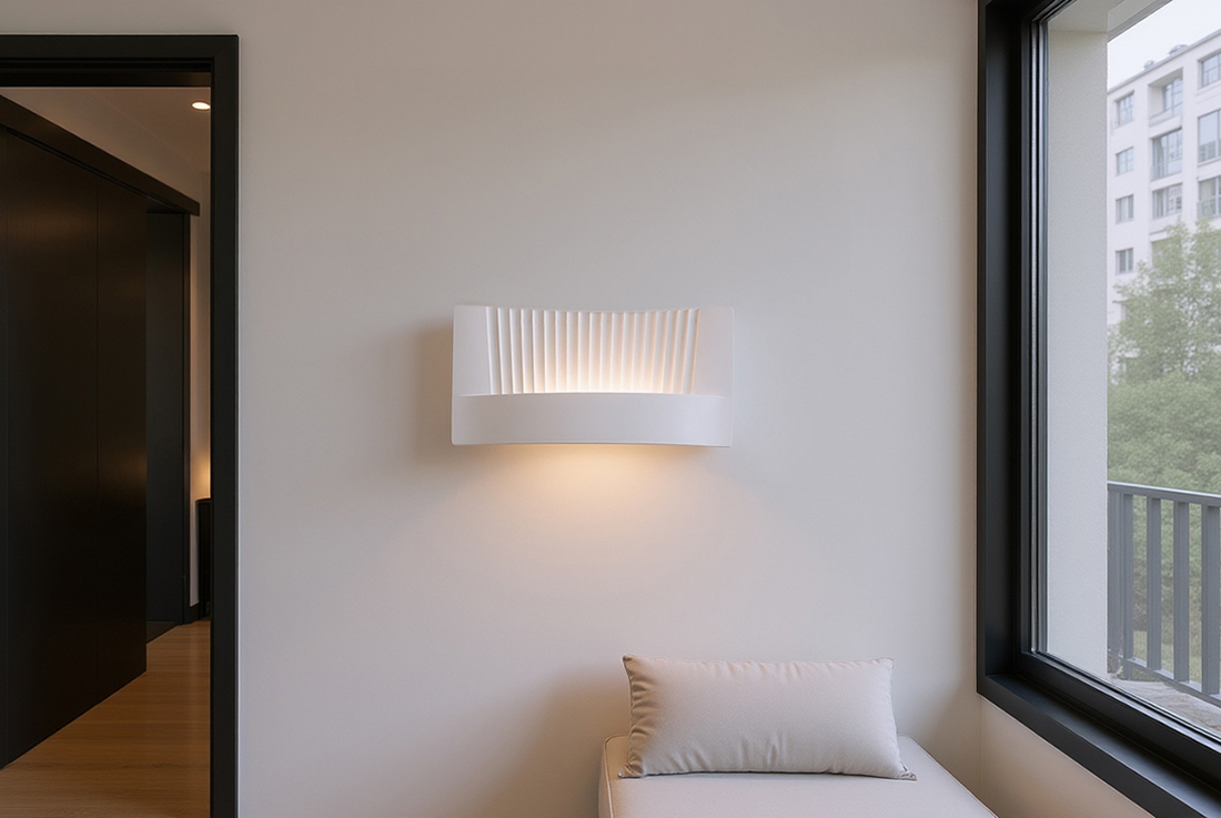 This double-emission wall fixture creates a calm, warm atmosphere that radiates from its source and gently envelops the surrounding space. The effect is enhanced by smooth, radial ripples across its wavy surface. The soft, natural light does not overshadow the charm of the object but instead transforms its appearance – emphasizing certain details while softening others.