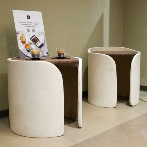 In this project, carried out by Nespresso HQ, a coffee corner was created, entirely designed from Ottan and made of Ottan materials, for the theme of “Local Touch” to be applied in every country. 2000 hazelnut shells and 2400 eggshells are up-cycled for each unit, and materials masterfully processed and designs born with elegant craftsmanship.