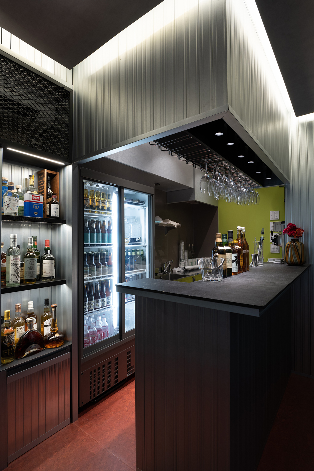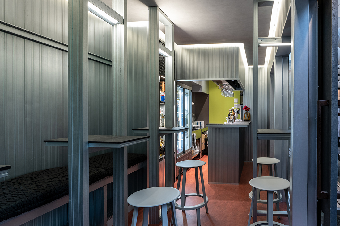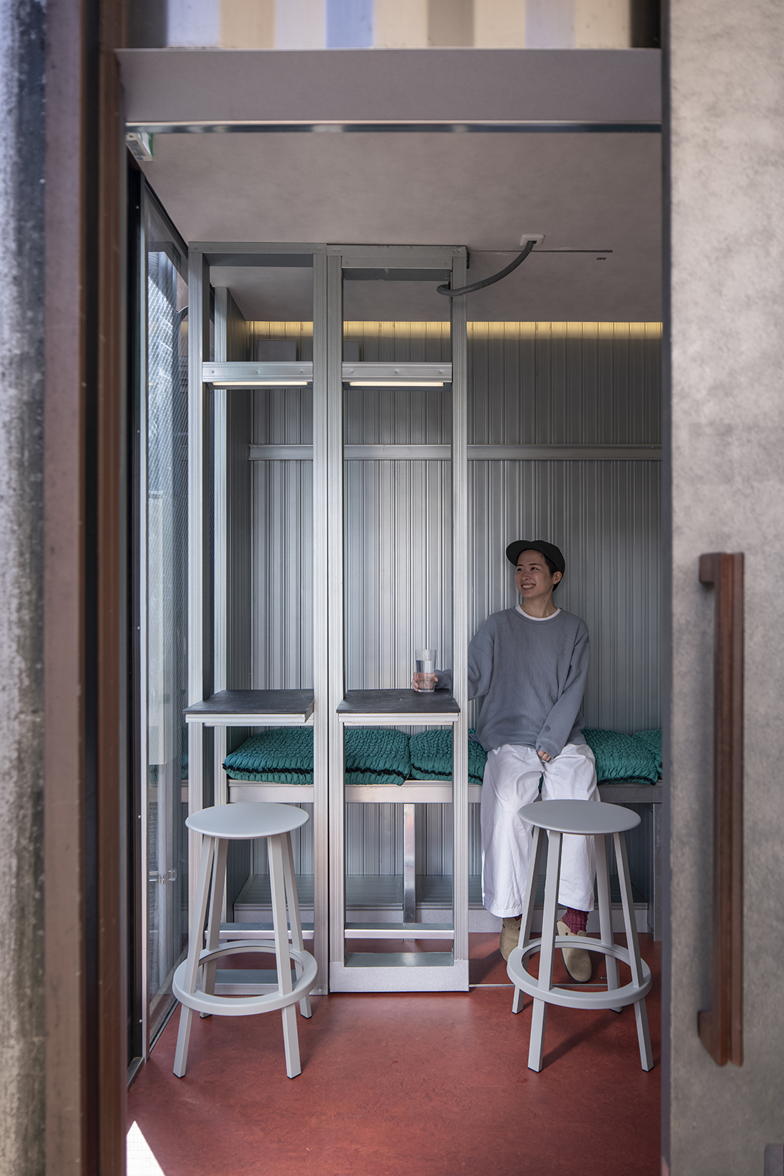 By embracing the rough and industrial character of the existing containers, light-gauge steel, flexible boards, and recycled ocean plastic were used as primary elements to create a flexible interior. This interior supports future modifications and reduces the initial investment required for subsequent tenants. Movable tables were introduced in the compact bar, and the lounge was reconfigured as a shared space accessible to the entire facility. A sunken seating area using igusa adds a tactile and aromatic sense of relaxation that contrasts with the industrial setting.