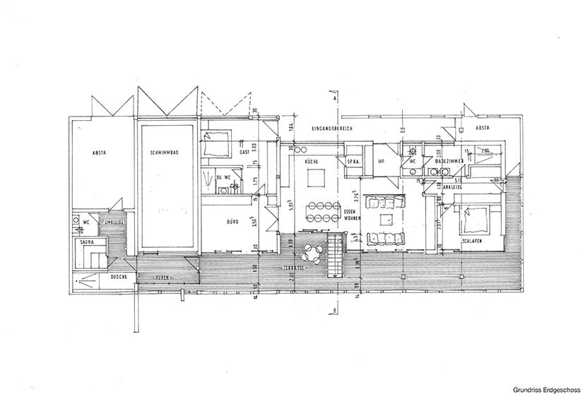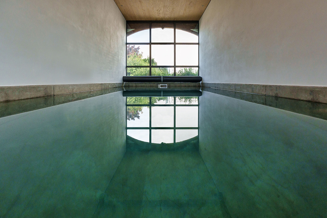 The spatial concept features an open kitchen, dining, and living area, a bedroom with an en-suite bathroom and dressing room, as well as an additional unit for guests or a caregiver. A wellness area with a pool completes the project.