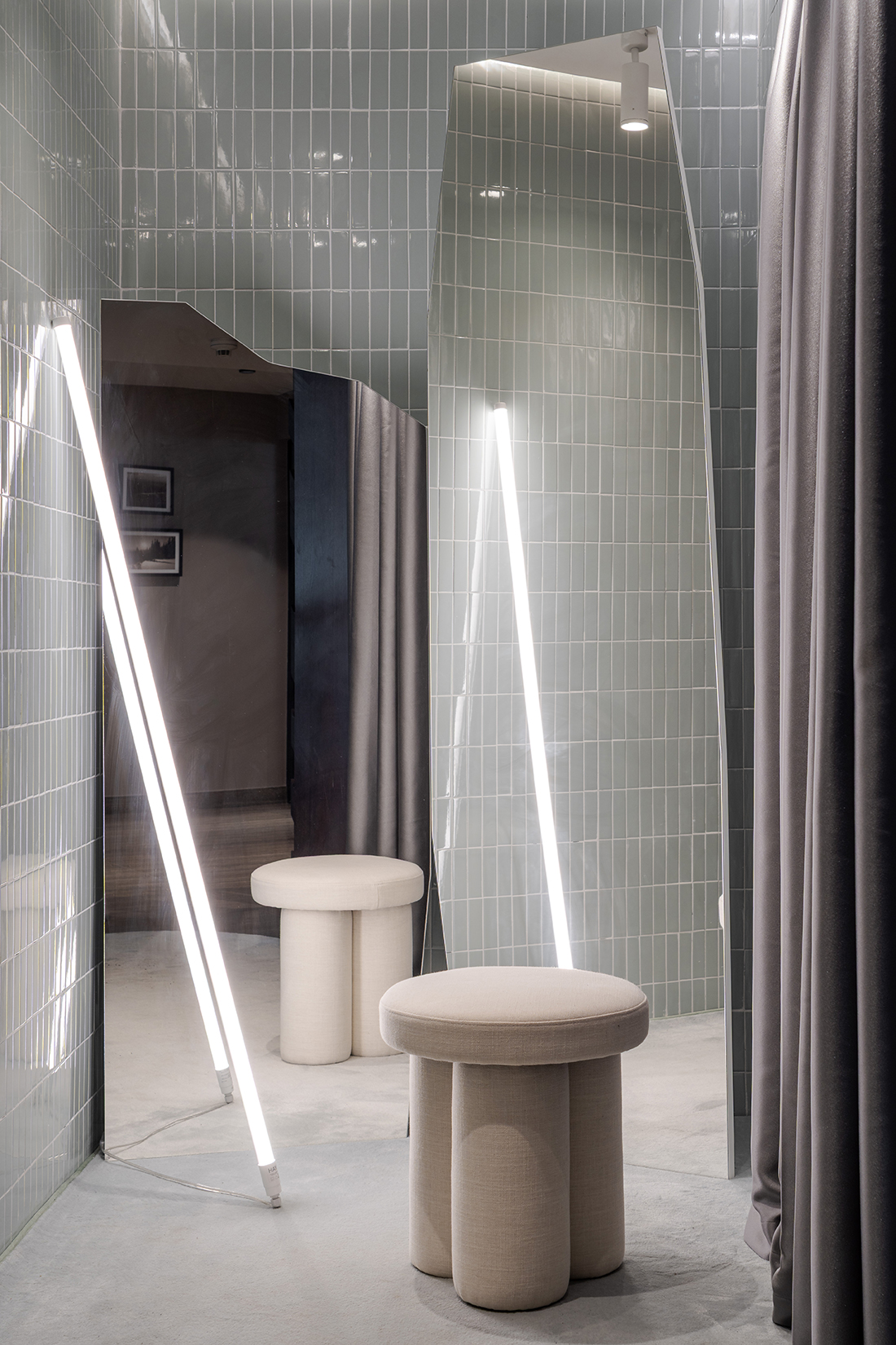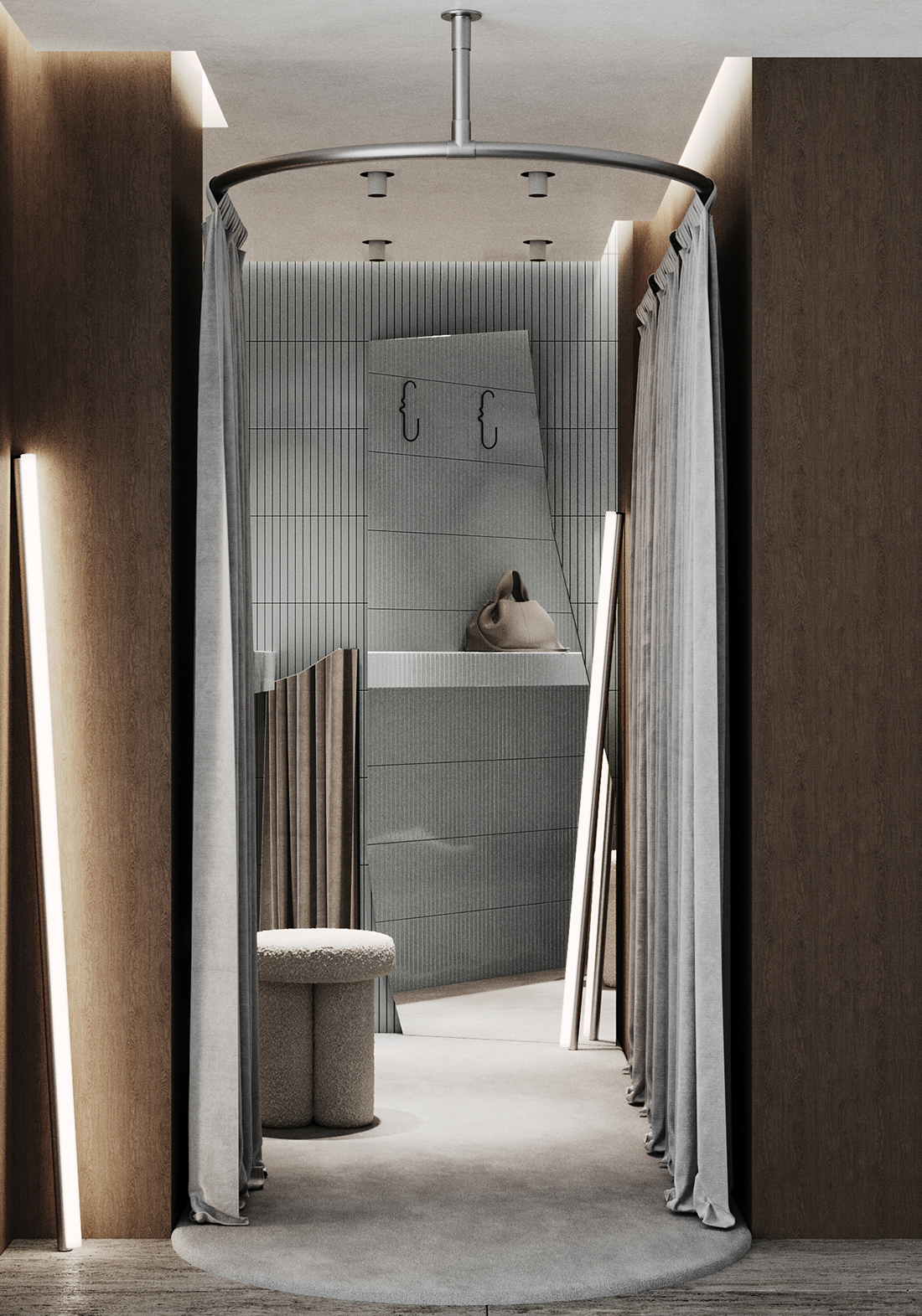 Lighting accents highlight natural materials and details, providing visitors with an authentic mountain experience in a contemporary, comfortable setting. This scene primarily enhances the effective display of apparel and the authenticity of the entire space, where the Bataković brand and nature exist in synergy. The fluidity of form, attention to detail, and harmonious use of materials make this venue a distinctive place for relaxation and enjoyment. The interior design draws on elements from nature to create a space that is both inspiring and welcoming, reflecting the brand’s values and the unique character of Kopaonik. This design approach was also important to the investors, who chose natural and high-quality materials for their models.