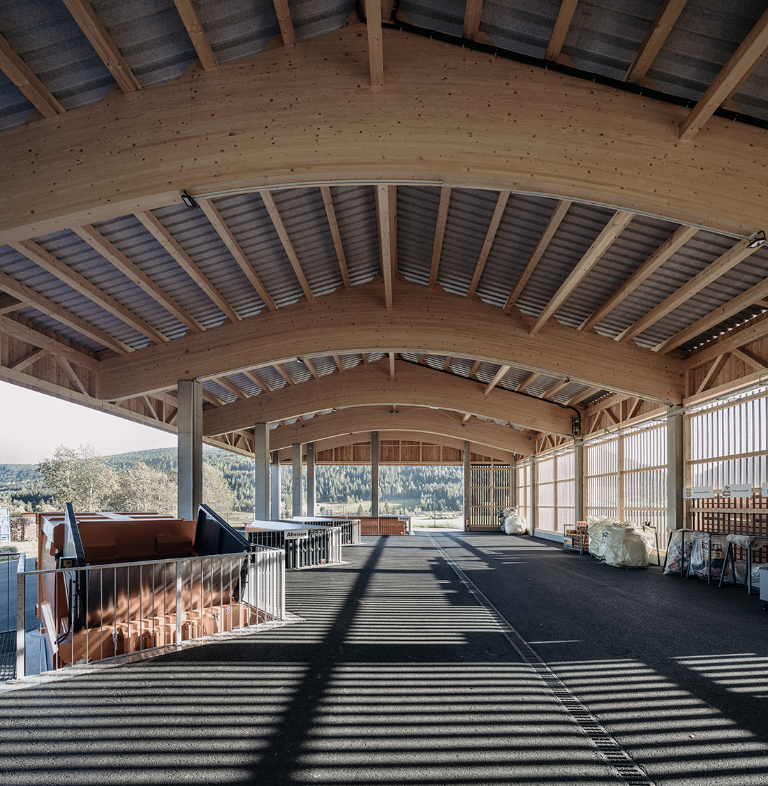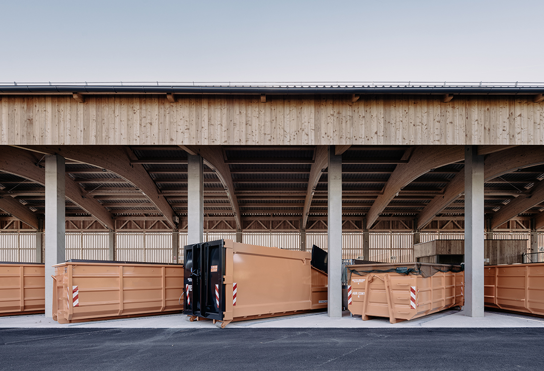 Functions and access are clearly organized from the north, while the arrangement provides protection from northern and western winds. The recycling center operates as a drive-through system. Green waste and glass containers are accessible from the north outside opening hours, with additional drop-off points along a covered lane. A centrally positioned office ensures full supervision. The construction yard includes four garages and staff facilities. Following the natural slope, the timber-clad buildings integrate harmoniously into the landscape.