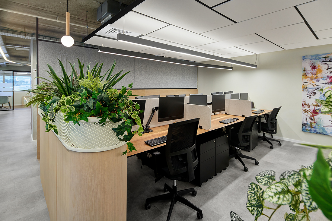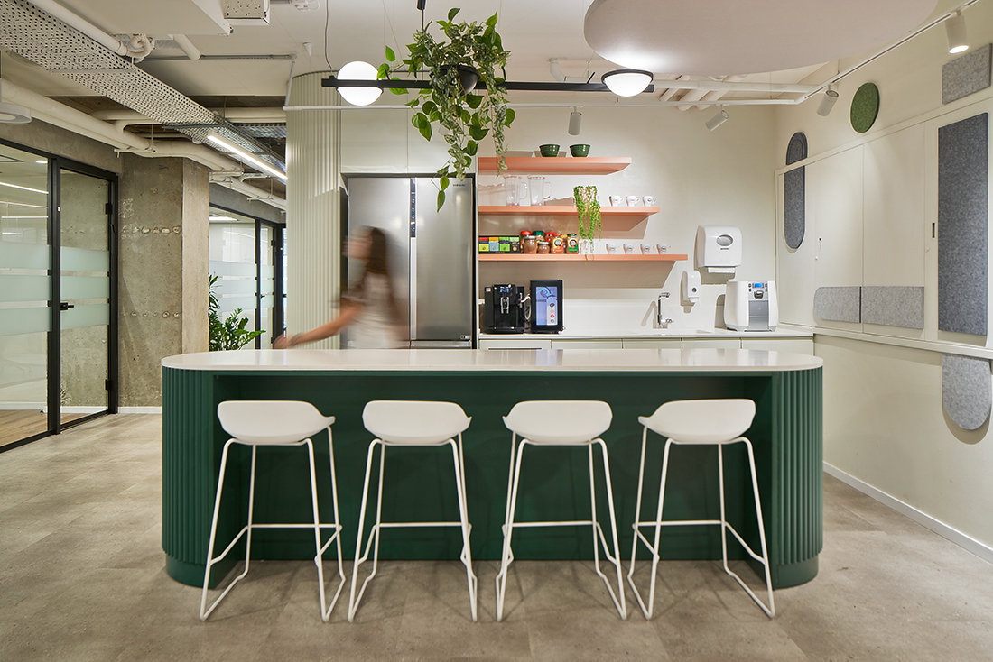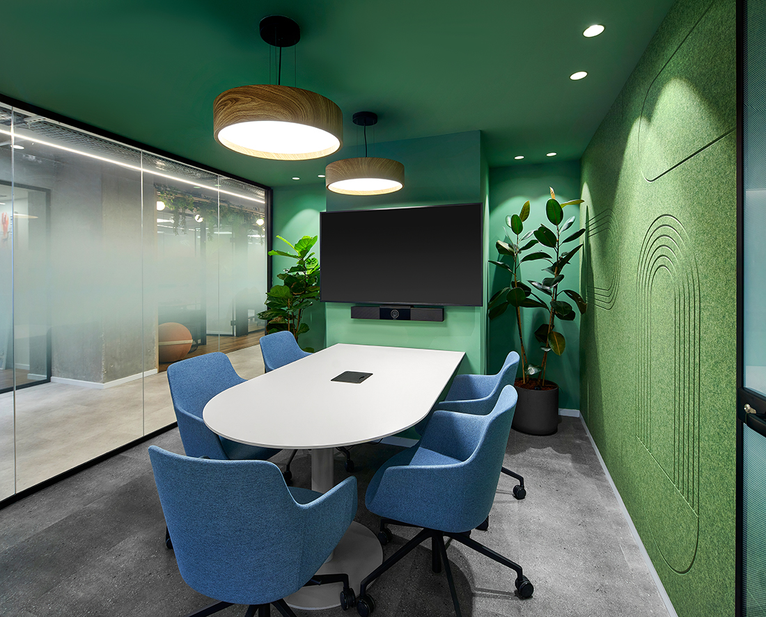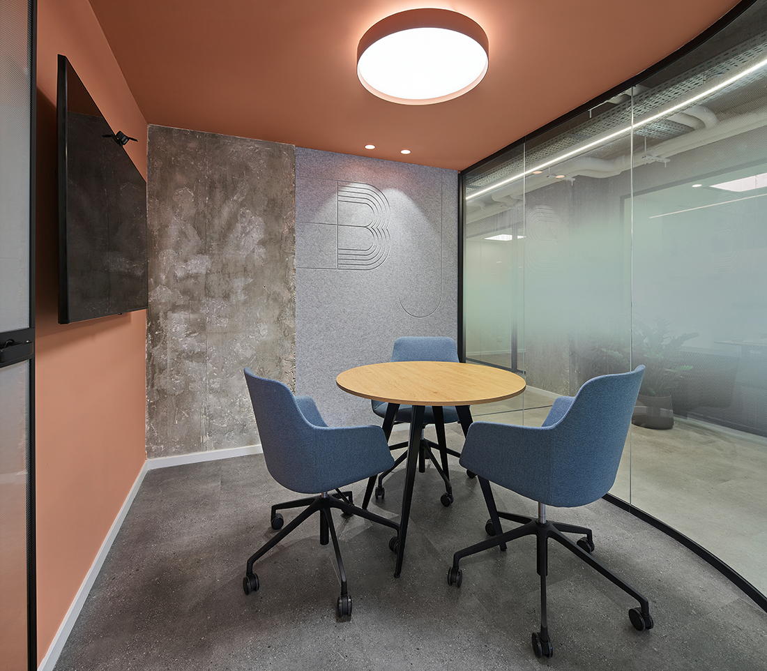 Public functions – meeting rooms, enclosed booths, cafeteria, and reception – were positioned adjacent to the core, to optimize the layout around the core, while perimeter areas were designated for offices. A circular corridor separates the inner and outer zones. The original concrete ceiling was exposed to enhance height perception and reinforce the industrial character. The letters B, D, and O were integrated as a central graphic element in a rounded configuration that continues into the acoustic panels, creating an efficient and visually refined workplace.