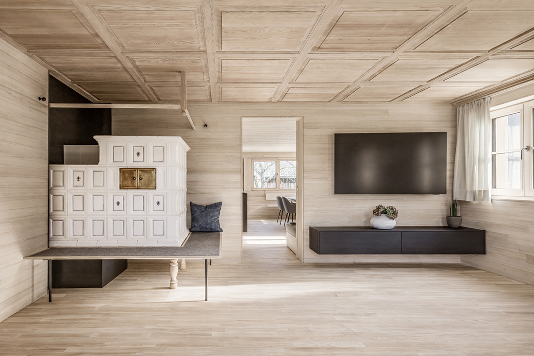 A winter garden and roof glazing were removed, circulation was reorganized, and a new staircase replaces the former spiral stair. The Schopf now forms a clear entrance zone and a filter between working and living. The beekeeper’s room is directly accessible. Inside, the floors and the coffered ceiling were preserved, the kitchen enlarged, and the wood stove retained. Photovoltaic panels are discreetly integrated into the roof. A project that shows: Revitalization means continuing a story, not reinventing it.