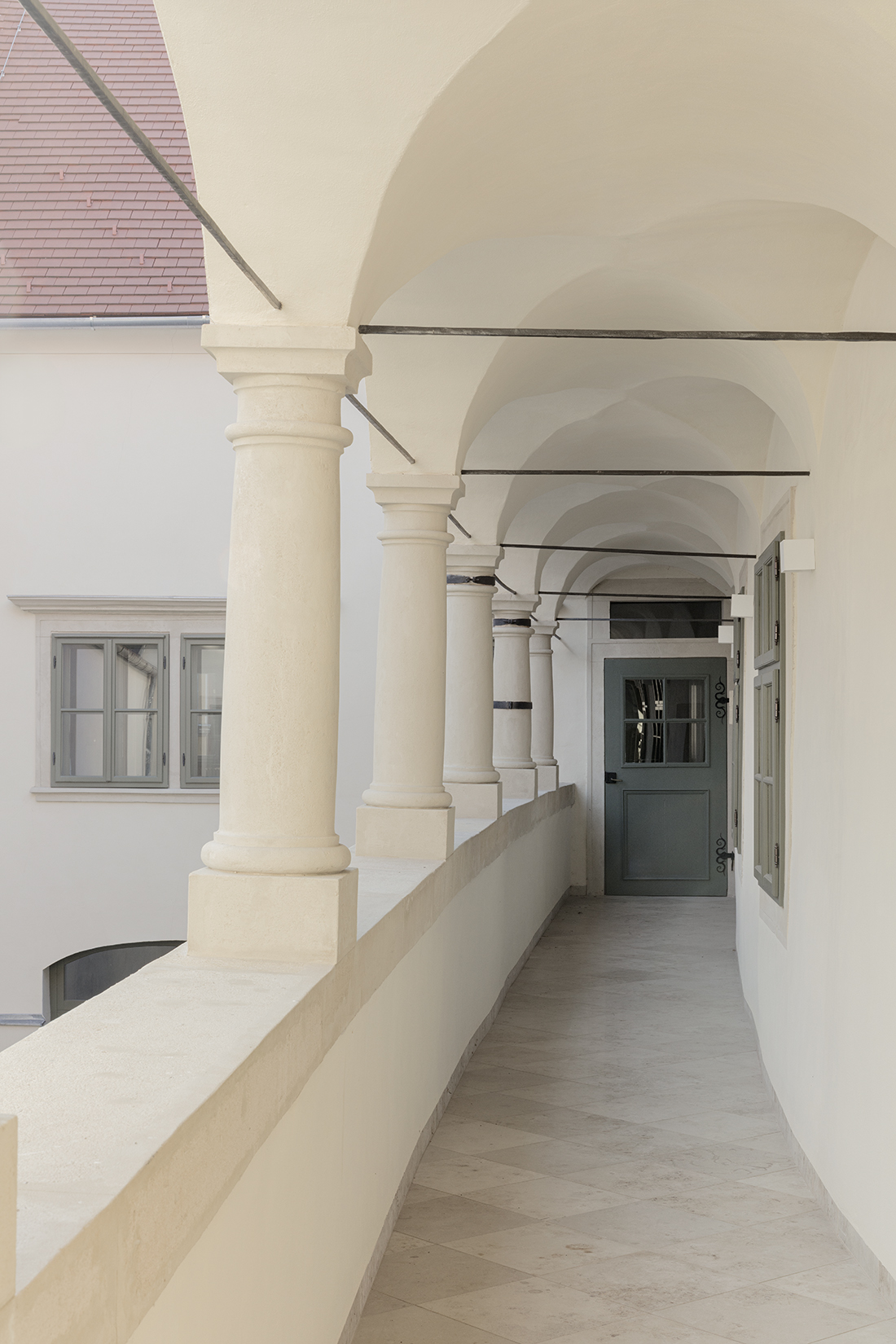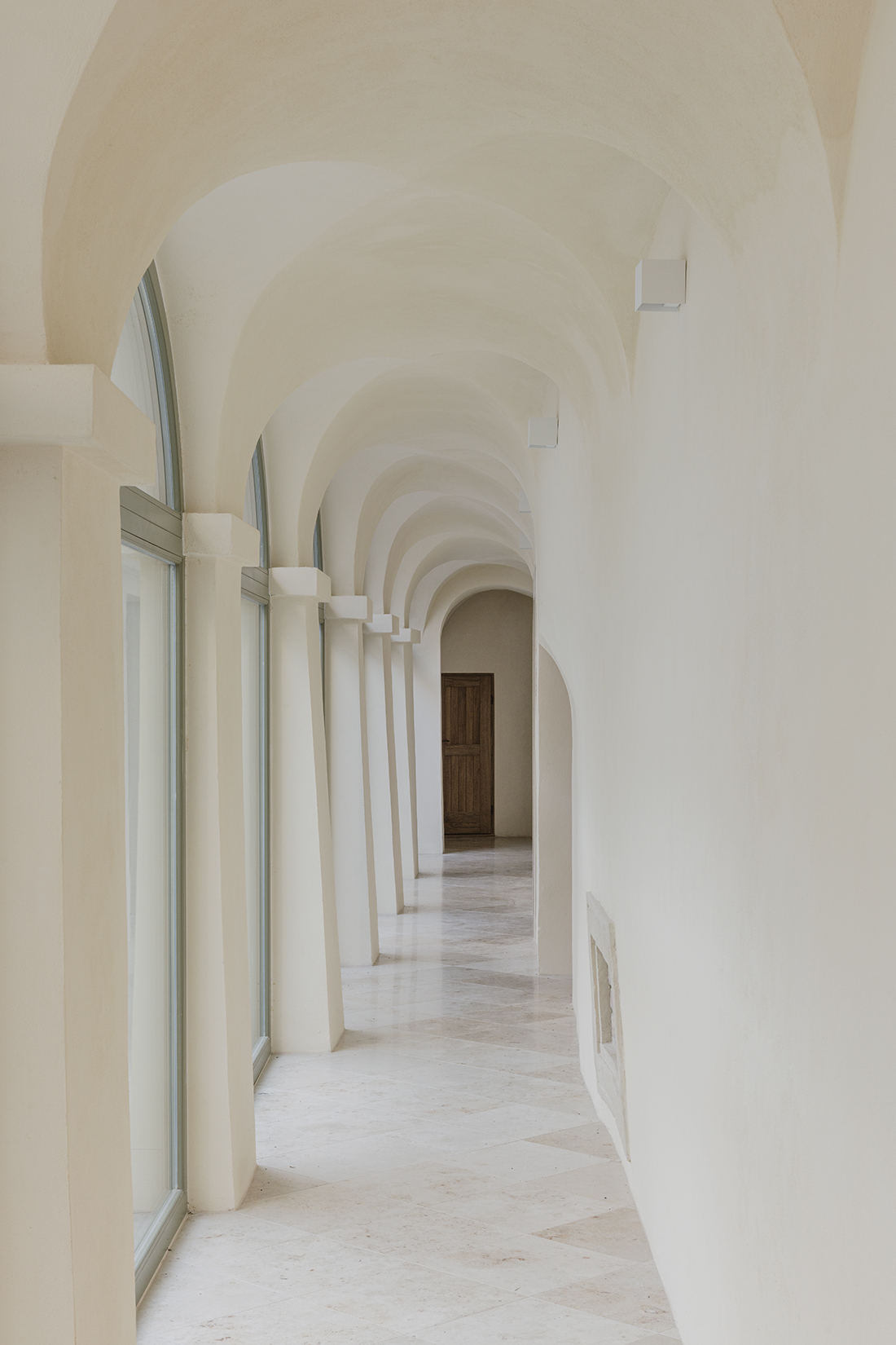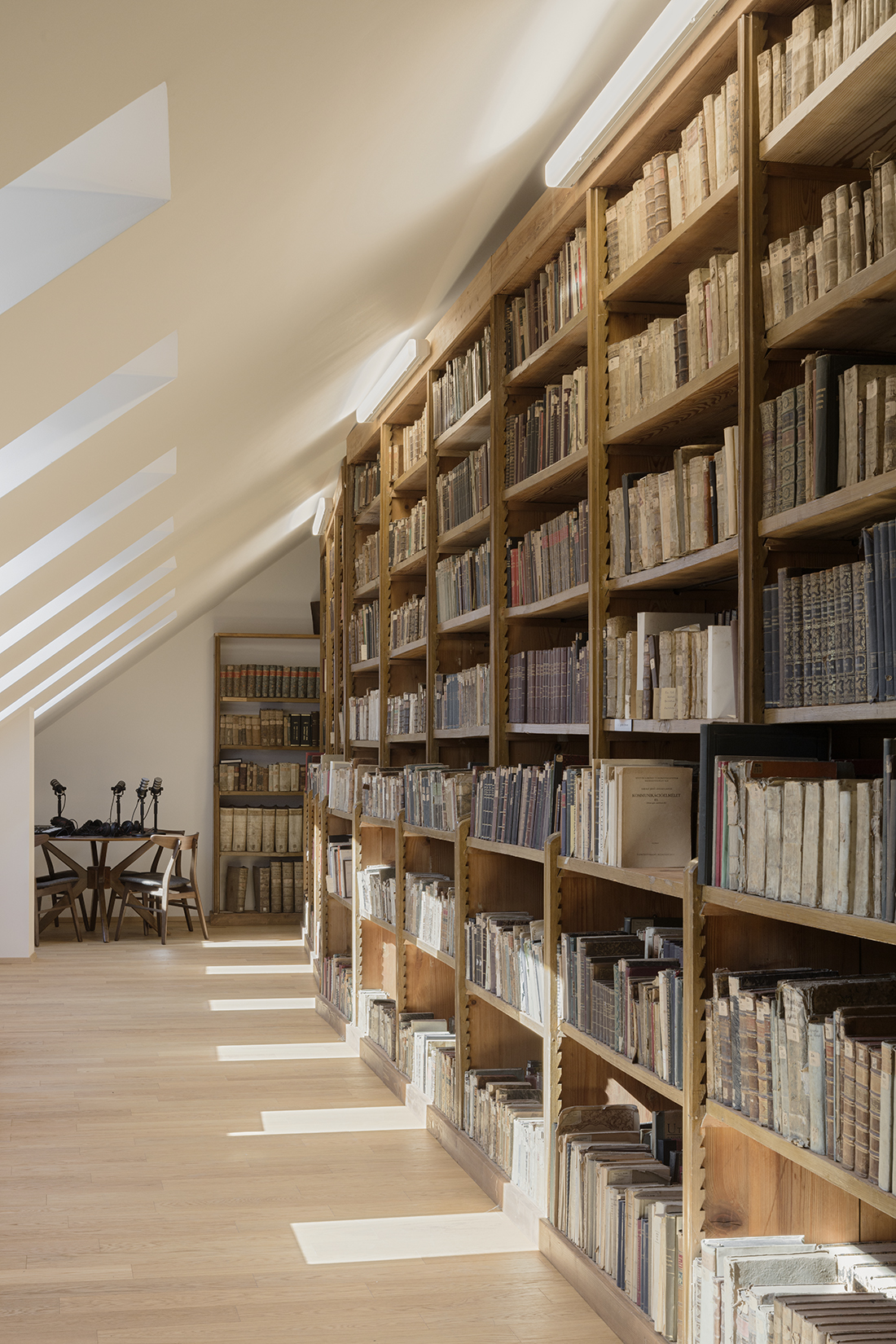 During the restoration, Baroque decorative paintings were uncovered in several locations beneath the whitewash. The project honors the historical significance of these discoveries and carefully restores them. Original doors, shelves, railings, and the building’s harmonious loggias, vaults, and arches coexist with contemporary interventions for the new functions, all expressed through a color palette combining wood, green, and white surfaces.