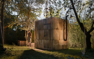 To the North-East the volume goes against the panorama. The three-sided glass doors slip and the main room of the house opens completely in the landscape. Terraces and white soles extend horizontally to the air in relation to the landscape and the space. Separate volumes, stone fireplace, and the internal iron stairs that connect the floating terraces outline the space and hide the entire carrying structure.
