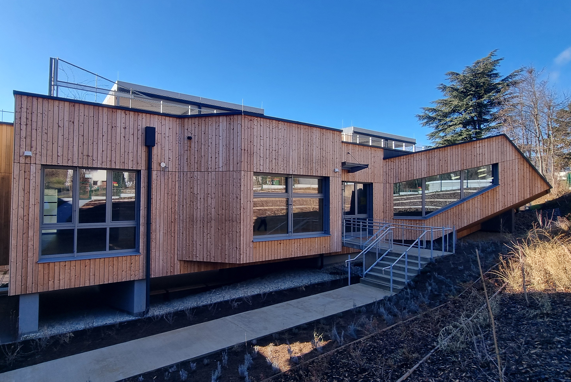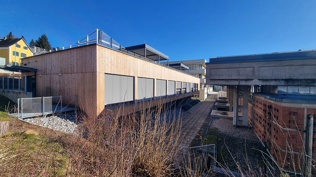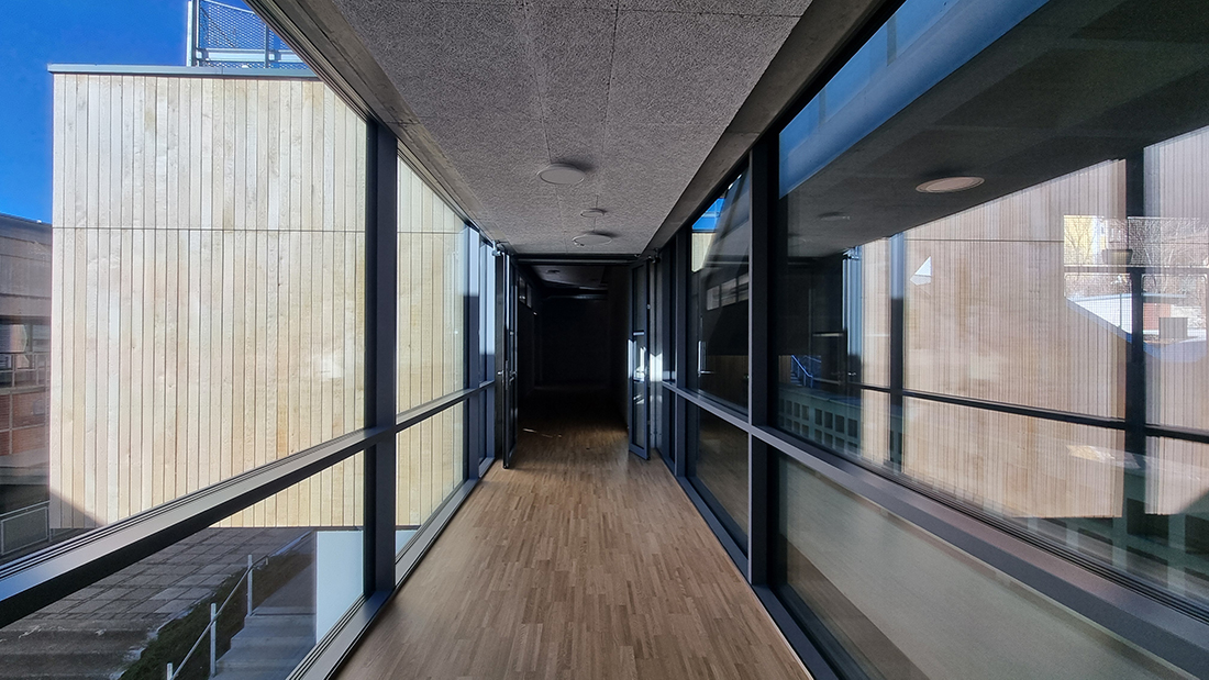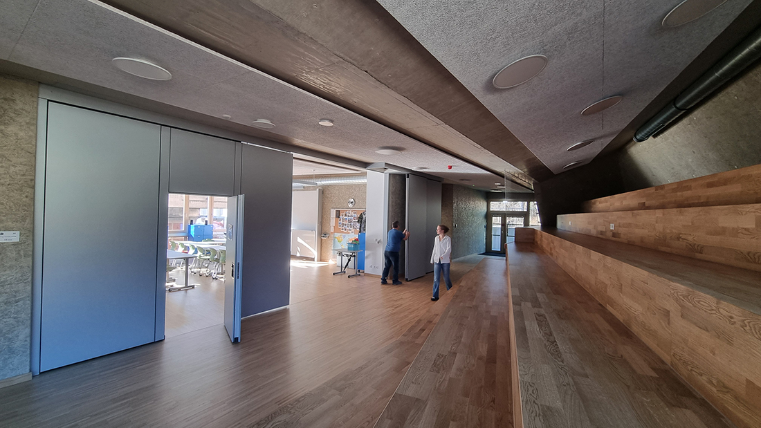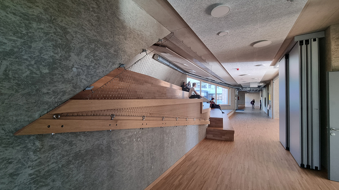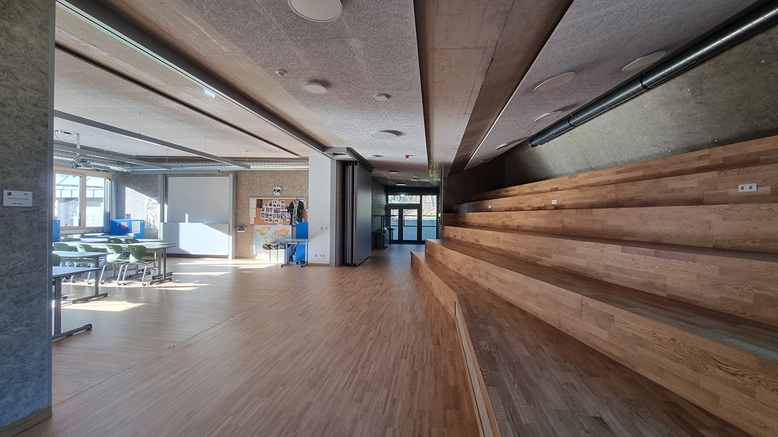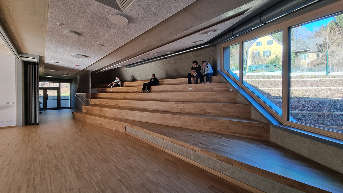 The chosen materials, particularly in the area of the stage, allow for an extremely free and sculptural expression. Consequently, in some areas, the new school extension doesn’t resemble a school building at all; rather, certain spatial sequences are reminiscent of a sculpturally designed, artistically sophisticated single-family home or a modern interpretation of a mountain cabin. It’s all a matter of perspective, encouraging people to spend time in and use the building for daily purposes, offering a viewpoint that differs from the seemingly logical and conventional one typically encountered in everyday life.