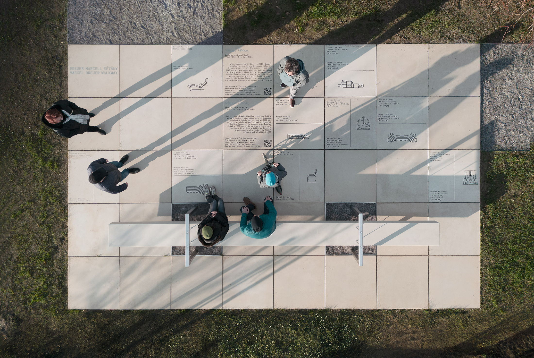 Realized through extensive professional and community collaboration, as well as crowdfunding, the bench aims to foster a cultural dialogue between Pécs and New York, in the spirit of Breuer’s legacy. The design was selected through an open competition organized in 2023 by the South Transdanubian Chamber of Architects, originally intended for a public memorial column. BIVAK Studio architects Tamás Máté and Áron Vass-Eysen instead proposed a street furniture that embodies Breuer’s design philosophy in both form and function. Inaugurated in 2025, the bench transcends the notion of a conventional monument, serving as an actively used public element seamlessly integrated into Pécs’s urban fabric, along the Marcel Breuer Promenade, one of the city’s key cultural axes developed as part of the European Capital of Culture Pécs 2010 program.