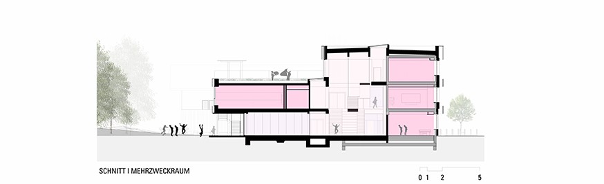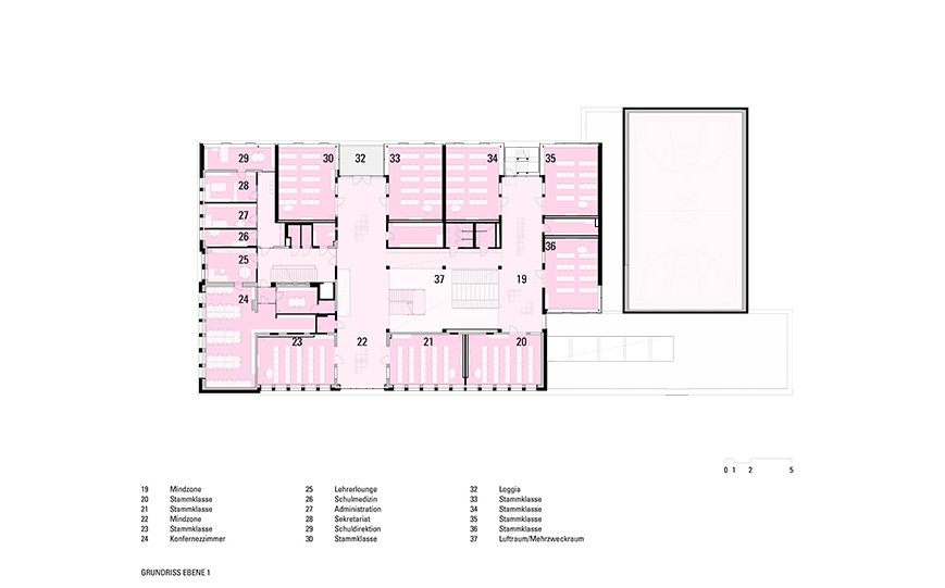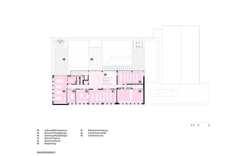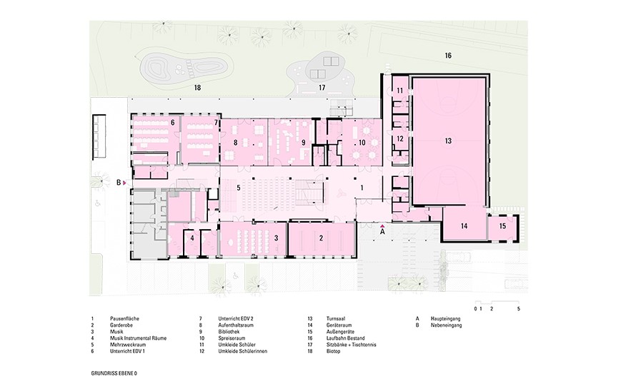 The new main entrance, with a forecourt and inviting entryway, connects the existing and new buildings. The clearly structured arrangement of classrooms, complemented by terraces and multifunctional areas, creates an innovative learning environment with short distances and barrier-free connections.